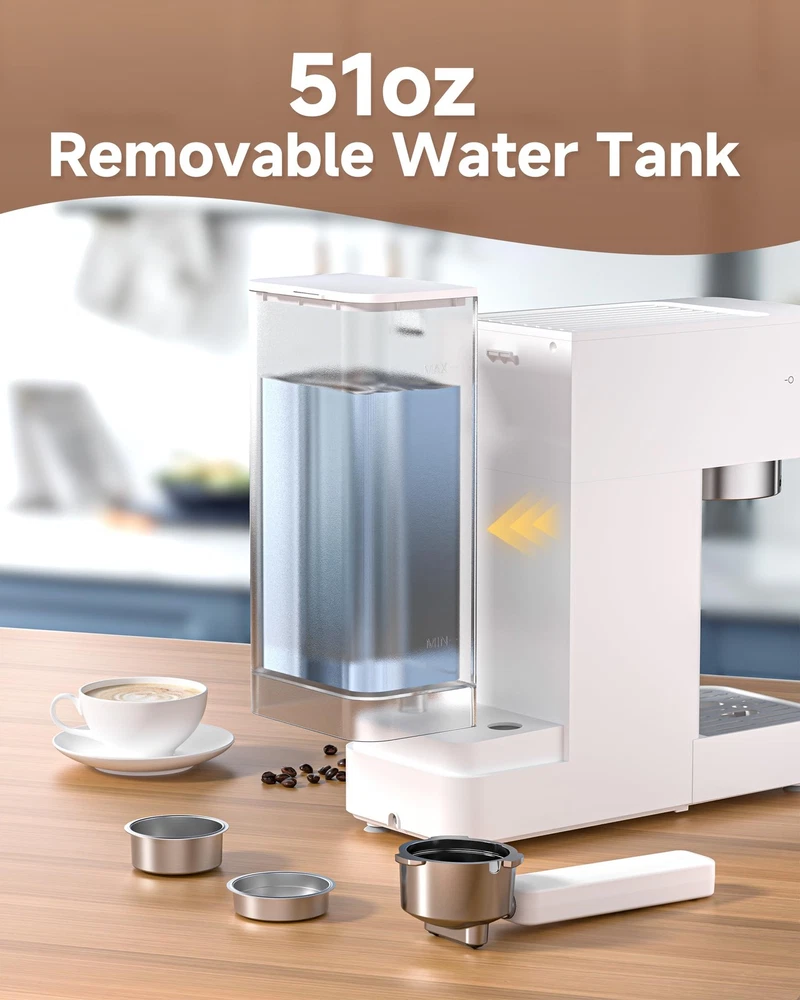 Professional 20 Bar Pressure System - Italian pump delivers 20Bar high pressure for richer crema and bolder flavor than low-pressure machines, perfect for crafting café-quality espresso at home 1350W Efficient Heating - Powerful preheating system heats in just 30 seconds while warming cups to preserve optimal temperature and flavor. With PID temperature control system controls the water temperature to a precise +/- 2°C, ensuring optimal espresso extraction Powerful Steam Milk Frother - Stainless steel milk frothing system supports 360° free rotation, powerful steam produces fine and dense milk froth with high water content, perfect for lattes/cappuccinos and other fancy coffees One-Touch Easy Operation - Intuitive button design makes it easy to get started even if you've never made coffee before. You can choose between single/double cup extraction or customise the extraction time to precisely control the strength of your espresso