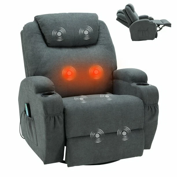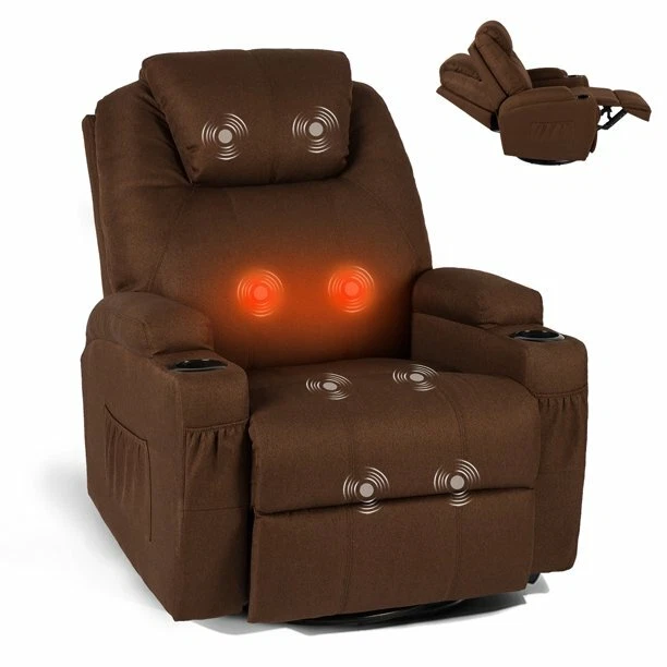 About this item Enhanced Massage Recliner Chair: The Esright recliner chair features an advanced 8-point massage system (specifically targeting the back, lumbar, thighs, and legs) combined with a lumbar heating function. This allows you to indulge in a comprehensive full-body massage experience, effectively promoting blood circulation, reducing fatigue, and alleviating stress. Customize your massage session with various modes and intensities via the convenient remote control Premium Upholstery & Robust Framework: Crafted with a generously overstuffed backrest, armrests, and cushion, the Esright recliner chair meticulously conforms to the contours of your body, ensuring ultimate relaxation. Its sleek and elegant design seamlessly blends with modern furniture, adding a touch of warmth and sophistication to your home. Constructed using formaldehyde-free wood boards that meet the rigorous P2 standards set by the California Air Resources Board (CARB), this chair guarantees both safety and durability Versatile Adjustable Recliner Chair for Adults: The Esright rocker recliner offers unparalleled flexibility, with an adjustable backrest that spans from 90° to 160° to suit your varying needs. It boasts a smooth 360° swivel function, perfect for casual sitting or reclining. Equipped with a convenient pull handle on the right side, the footrest automatically extends with a simple tug, providing unparalleled ease of use. Experience extreme comfort and a cinematic feel right in your own home Straightforward Assembly & Comprehensive Customer Support: The Esright recliner chair includes comprehensive assembly instructions and user guide for effortless setup. It takes just 10-15 minutes to complete the installation process, with no tools required. In the event of any shipping damage or defects during use, please reach out to us without hesitation. Our dedicated customer service team will provide the best possible solution within 24 hours.Kindly proceed with assembly once you have received both boxes Dependable Comfort for All: The Esright medical-grade standing recliner stands as an exceptional choice for individuals facing mobility challenges, recovering from surgical procedures, or simply seeking a luxurious seating option. Crafted with a treated fabric surface, it ensures a comfortable and soothing experience tailored to your specific needs. Whether you're looking to relax in your living room, require assistance with daily activities, or need a reliable chair for therapy sessions, this recliner offers unparalleled support and comfort Upgraded design, high quality steel frame and soft fabric material. More durable and comfort. The massage recliner can be used in the living room or bedroom or office to enjoy leisure time. The swivel chair is designed with massage and heat function by remote control. Recliner Chair Dimension Overall size: 33.5"(W) x 35.8"(L) x 43.2"(H) Seat Height: 18.9" Fully Reclining Length: 65" Weight Capacity: 300lbs Rocking Chair Detail Color: Coffee Surface Material: Fabric Frame Material: CARB Certified Board and sturdy iron Easy Assembly Needed Package Details box 1 (chair base) box 2 (armrests and chair back) Recline Method Manual control by buckle at right side Heat & Message Function 8 vibration massage nodes for back, lumbar, thigh and legs 2 vibration intensities 5 massage modes Heat function for lumbar Remote Control The swivel chair is designed with massage and heat function by remote control. Comfortable Padded Headrest Convenient Cup Holder Durable Steel Frame