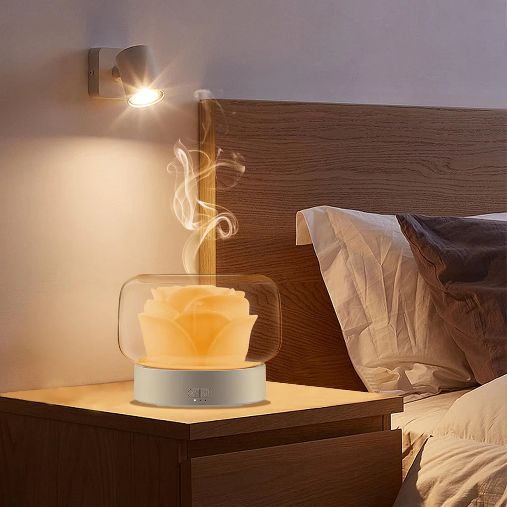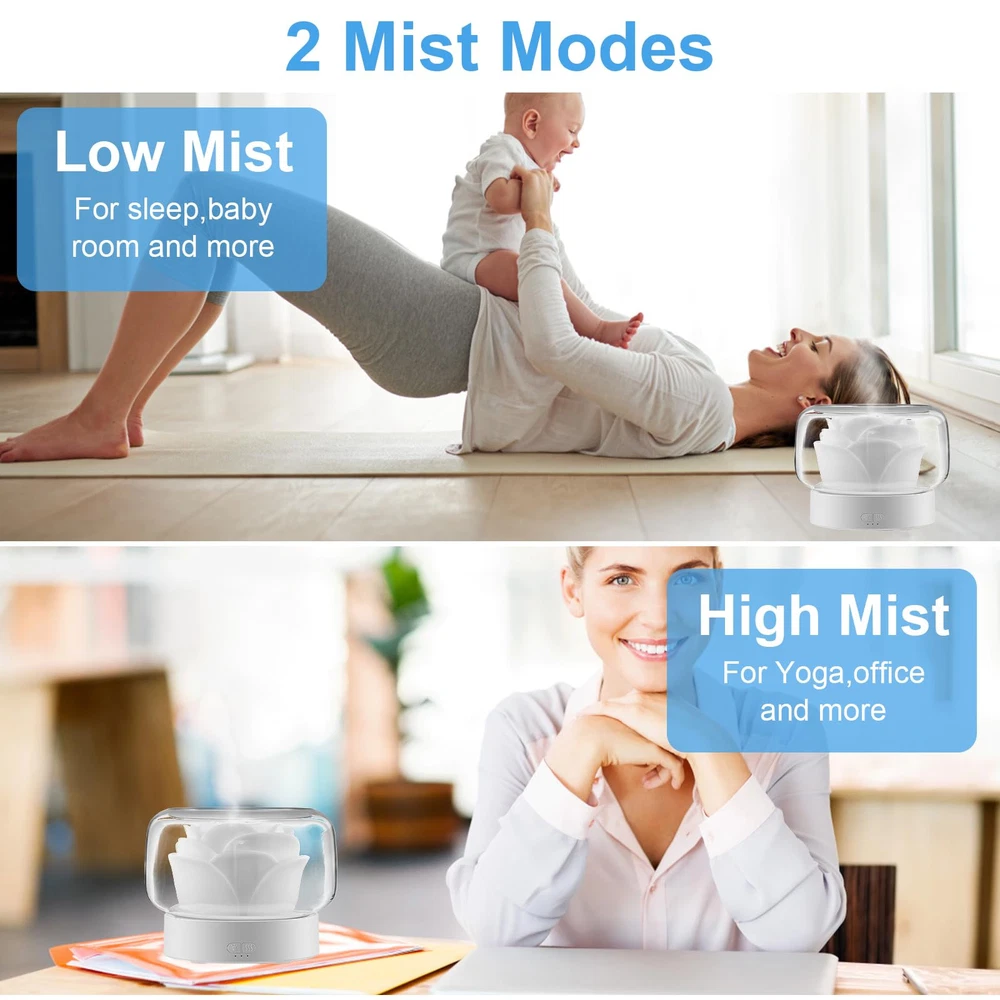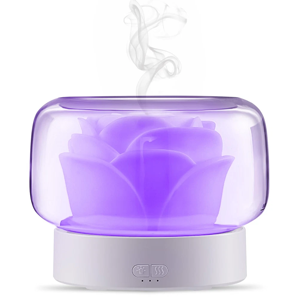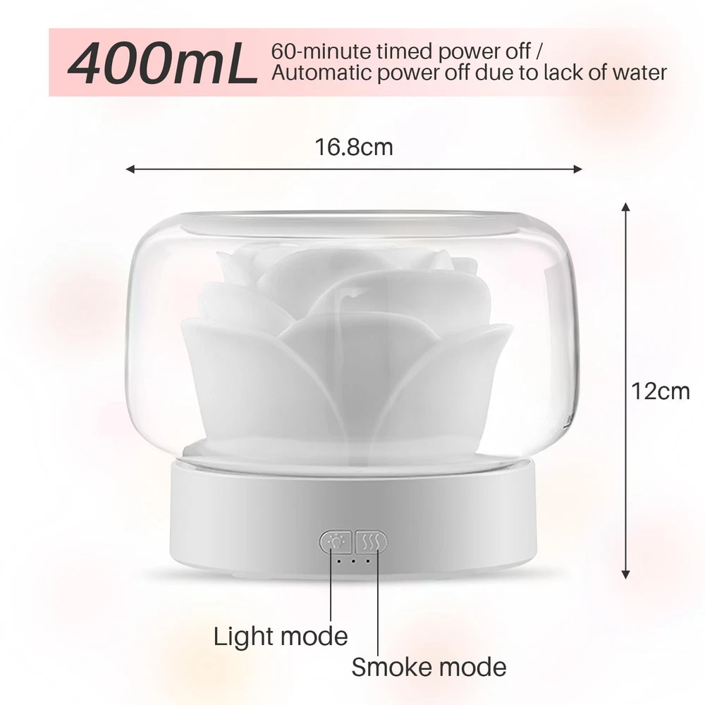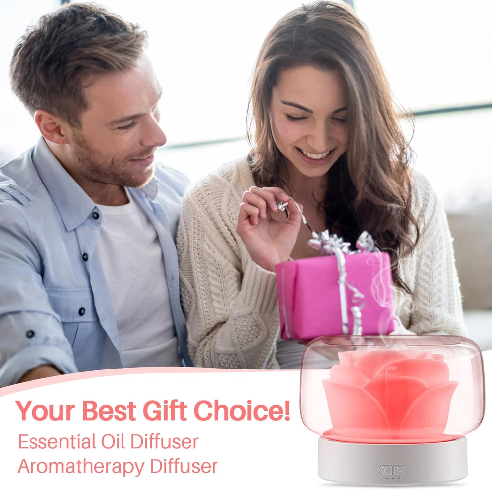 【Aromatherapy Diffuser & Humidifier】Rose flower looking aromatherapy diffuser with humidifier function, 2-in-1 unique design. The essential oil diffuser allows you to add drops of your favorite oil to the water to create a fragrant mist. Diffuse the essential oil with the water and mist helps to create a calming atmosphere. Also the humidifier can help to improve the air quality. 【With 7 Colors Night Light】The aromatherapy diffuser has 7 changing colors LED light! Magic night light fit your mood in 7 colors: white, green, blue, yellow, purple, red, navy blue. Nice decor for home bedroom and accompany with you sleep at dark night. 【Low Noise & Safety】Adopted noise reduction technology, this essential oil diffusers can quietly work, help to soothe the mood, relieve stress, create a soothing environment for relaxation, learning, working and sleeping. Smart auto-shut-off protection when water runs out, effectively prevent dry burning, which will greatly extend the service life of the humidifier and ensure safe use. 【Easy to Use】400mL large water tank, 2 mist modes, can keep working 20 hours in high mist mode or 26 hours in low mist mode. Large open mouth of this oil diffuser humidifier, easier to refill water, add essential oils and clean tank. The flower part could be took out. Please note, don't let water exceed MAX line and clog top mist outlet. English manual is included and you can use it easier. 【Great Gift】aromatherapy diffuser, unique rose design blends perfectly with any style. 2-in 1 essential oil diffusers humidifier, creating ambiance, meditation or use it as a night light. Ideal for yoga, meditation, relaxing, SPA, reading, studying, sleeping or working, use in office, gym, bedroom, living romm, home. The best gift choice for friends or, family. Christmas gift, birthday gift, mom birthday, etc.