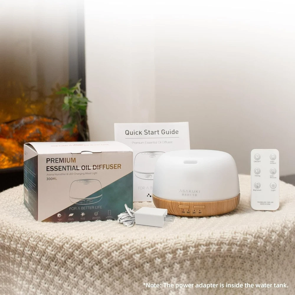 Essential Oil Diffuser, Ultrasonic Aromatherapy Oil Humidifier with 7 Colors Lights 2 Mist Mode for Home Small, Compact But Powerful: aromatherapy diffuser combines the benefits of aromatherapy and humidification in one compact device. Its classic and adorable design with 7-color light options makes it perfect for our bedroom or even for children's use, with small "L x "W x "H size. The packaging includes a diffuser, USB-C cable, user manual, and remote control, without a power adapter. Easy Opreation: The included remote control allows you to easily control the light, mist mode, and timer settings of the diffuser from up to 9 feet away. It is powered by a USB connection, please use the power current greater than or equal to 1A. Safe and Reliable Material: The diffuser is made of high-quality PP material, which is not only durable but also safe for use. It also features a built-in waterless auto shut-off function, providing peace of mind for families with children. Enhance Relaxation and Create a Soothing Environment: Aromatherapy is a great way to relax and create a calming atmosphere. Simply add your favorite essential oil to the water tank and enjoy a personalized experience that can help calm your mind and get a deep sleep. Great Gift Idea For Everyone: If you're in the market for a nice and practical gift, you can stop looking. This great aromatherapy essential oil diffuser is a thoughtful and handy present, one that everyone can benefit from. With a combination of style, design and function like that, it's a quality-assured hit! Small 300ML 2-in-1 Essential Oil Diffuser