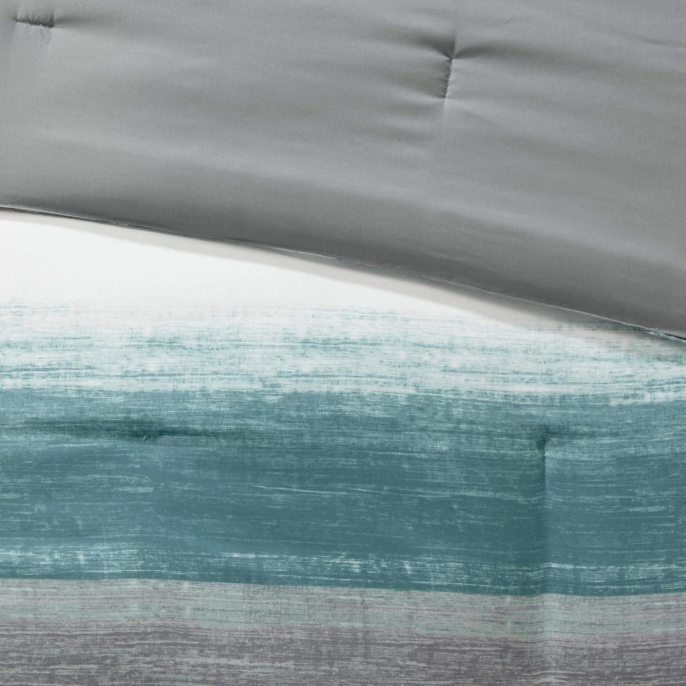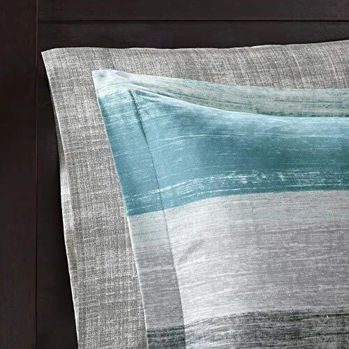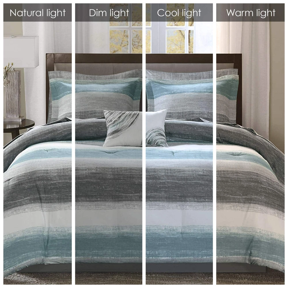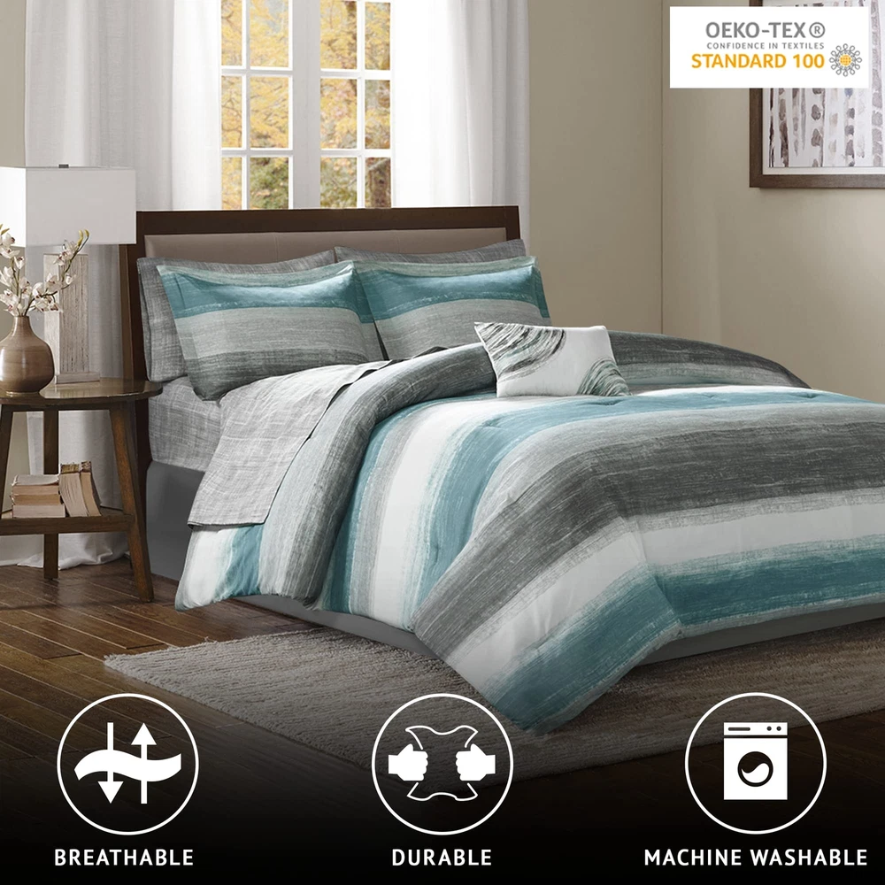 The Essentials Saben 9 Piece Complete Bed and Sheet Set provides a casual and modern update to your bedroom. A printed watercolor stripe motif, in aqua, grey, and white hues, is beautifully displayed on the ultra-soft microfiber comforter. The coordinating shams complement the pattern seen on top of the bed to pull the ensemble together. A 100% cotton sheet set includes a fitted sheet that fits up to a 16-inch mattress, a flat sheet, and two pillowcases in a textured grey hue to complement the casual style of the comforter. Completing the look is an embroidered decorative pillow in coordinating colors, while a solid grey bed skirt adds a creates a crisp finish to this incredibly soft complete bed and sheet set. 9 Piece Bed in a Bag Set - Elevate your bedroom with our comforter and sheet set. Featuring a coastal comforter with stunning watercolor prints and a chambray 100% cotton sheet set, it offers a complete and stylish makeover for a total refresh Coastal Bedding Set - The Saben Comforter Set features a charming watercolor print in stunning grey, white, and aqua contrasts. Crafted with a soft brushed microfiber cover and lightweight, skin-friendly poly filling, it offers year-round comfort 100% Cotton Sheet Set - The Bed in a Bag includes a lightweight & breathable 100% muslin cotton sheet set. The grey chambray finish adds sophisticated contrast. The fitted sheet elastic pocket fits mattresses up to 14 inches (12 inches for Twin size) OEKO-TEX certified for superior COMFORT and WELLNESS, as they are free from any substances or chemicals that may compromise quality, and is hygienically treated for lasting freshness DURABLE & EASY CARE: Our microfiber comforter and cotton sheets offer durability to withstand daily wear and tear. Simply machine wash cold on LOW cycle. Do not bleach, Tumble dry LOW HEAT. Iron on medium heat if needed. Decor pillow spot clean only