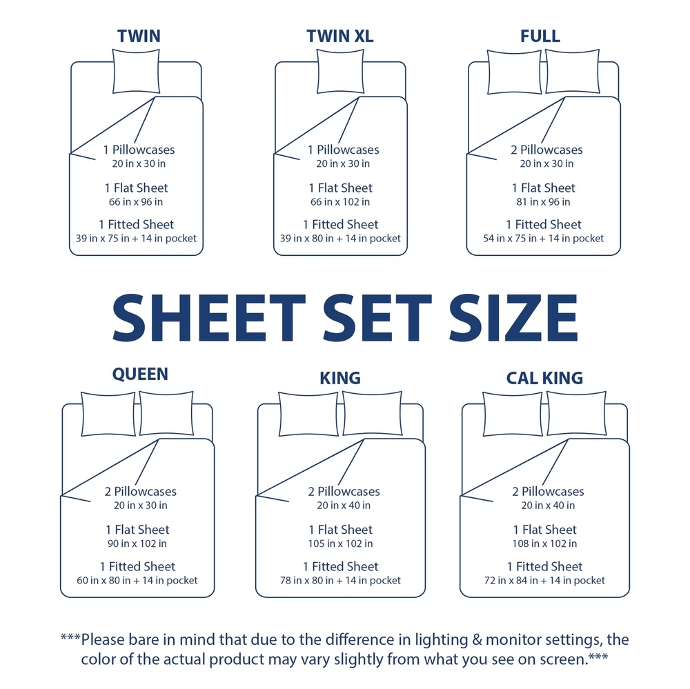 COLOR DIFFERENCE: We work hard to ensure the colors you see online are close to the colors you receive. Please also bear in mind that sometimes due to different lighting and computer monitor settings, the colors of the products viewed in person may vary slightly from what you see on screen. WHAT IS IN THE PACKAGE: King set includes: 1 Fitted Sheet 78" x 80", 1 Flat Sheet 102" x 105", 2 Pillowcases 20" x 40". WHY WE LOVE THESE SHEETS: 100% microfiber polyester, double brushed to finish for amazing softness. The -resistant and incredibly durable design will pamper you all night and leave you feeling rested. HOME ESSENTIALS: Our fitted sheets are fully elasticized with extra strength elastic and can easily accommodate mattresses up to 16” thickness for a snug fit. EASY CARE: Machine wash on gentle cycle with cold water and like colors. Then tumble dry on low or air dry for best results OEKO-TEX STANDARD 100 Certified – an industry standard that proves that the product has been tested to be free of harmful substances & chemicals