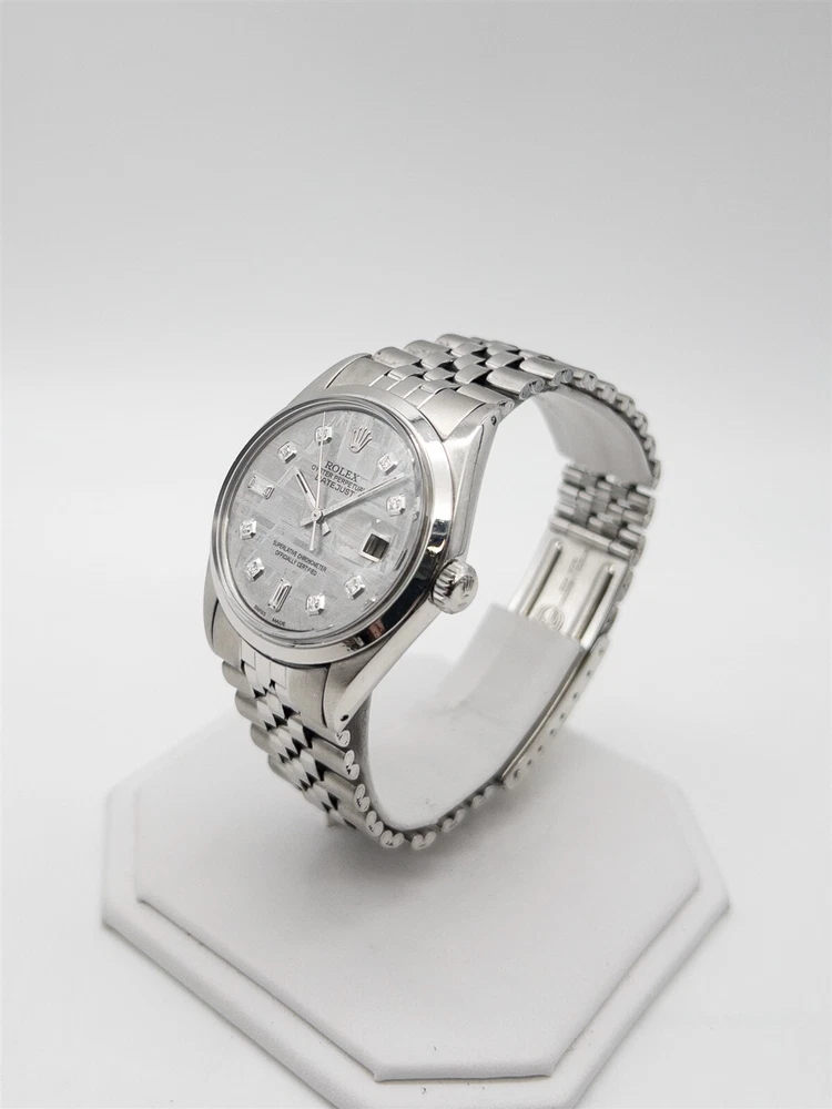 Item Description: Mens ROLEX 36mm DATEJUST in SS and a METEORITE DIAL with Natural VS G Baguette and Round Diamonds. HIGH GRADE piece and one stunning ROLEX. Retail $14,000. 7.3 inches long and so nice. WOW!!! Just serviced and runs and keeps time. GORGEOUS. Just serviced and runs and keeps time. This is a service that ROLEX would charge around $2000 for..you get it for peace of mind at no additional charge. WOW!!! Get a steal. Brand: Rolex Metal: SS Movement: AUTOMATIC Gram Weight: 83g Powered by SixBit's eCommerce Solution