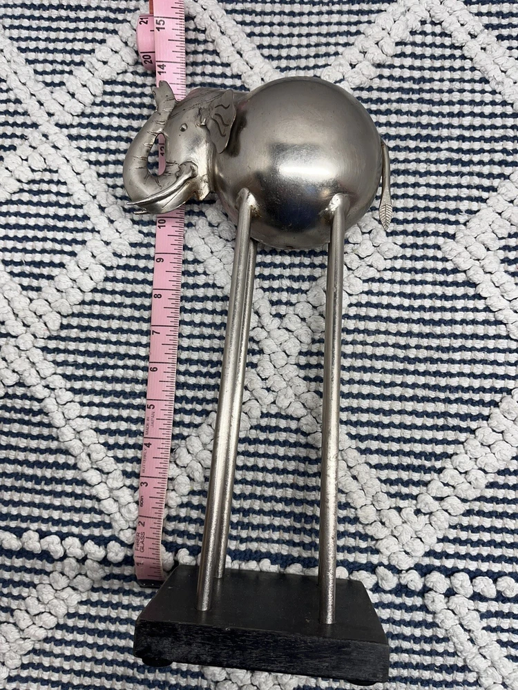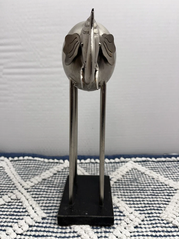 This stunning metal statue features a majestic elephant, standing at 13 inches tall and 5 inches long. The intricate details and abstract design make it a unique addition to any art collection. The statue is made from high-quality metal and features a gray color that will complement any decor. Perfect for animal or elephant lovers, this single-piece work is an original and licensed reproduction. The statue is perfect for display in any room, and its small size of up to 12 inches makes it easy to move around. Add this beautiful piece to your collection today!
