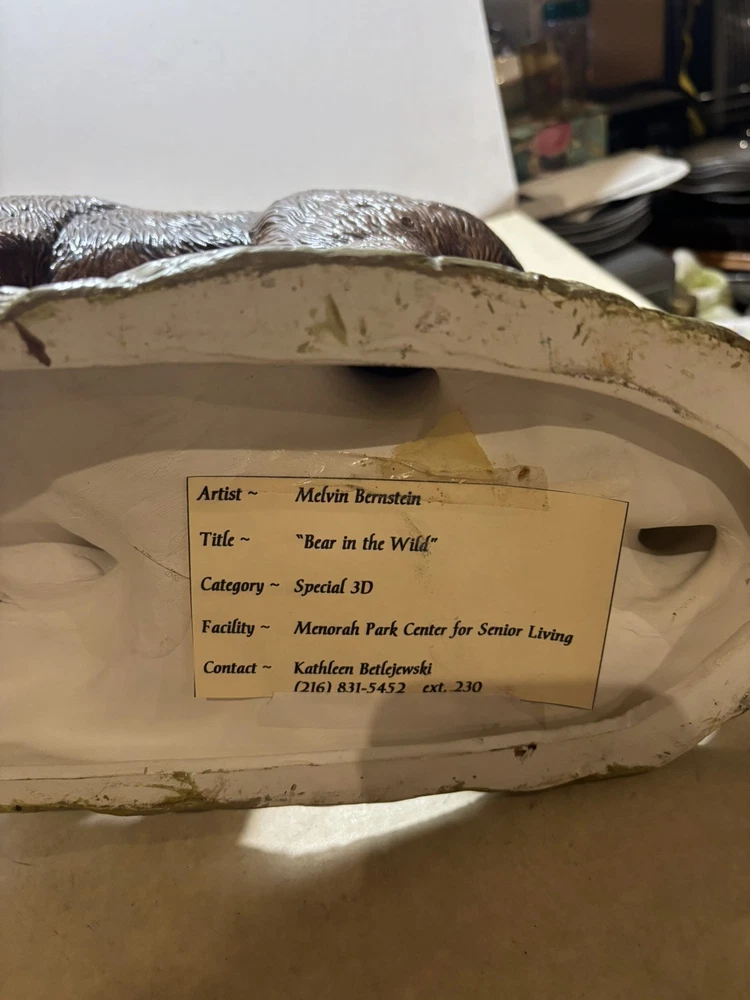 The sculpture, titled "Grizzly Bear Hunting," is a figurative art piece region of origin and is a unique representation of animals in art.