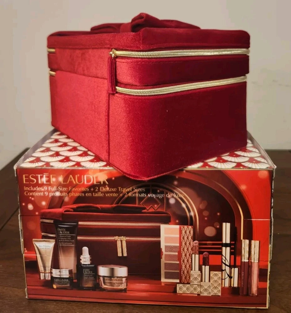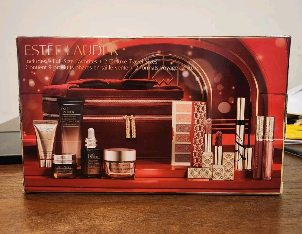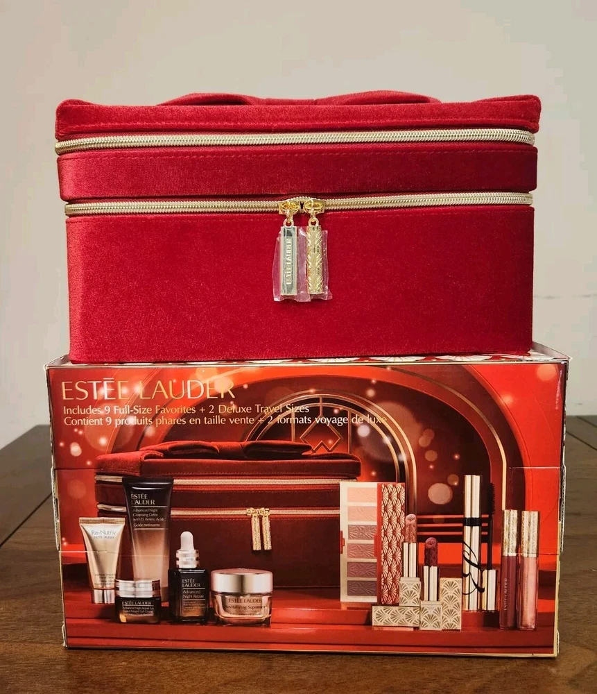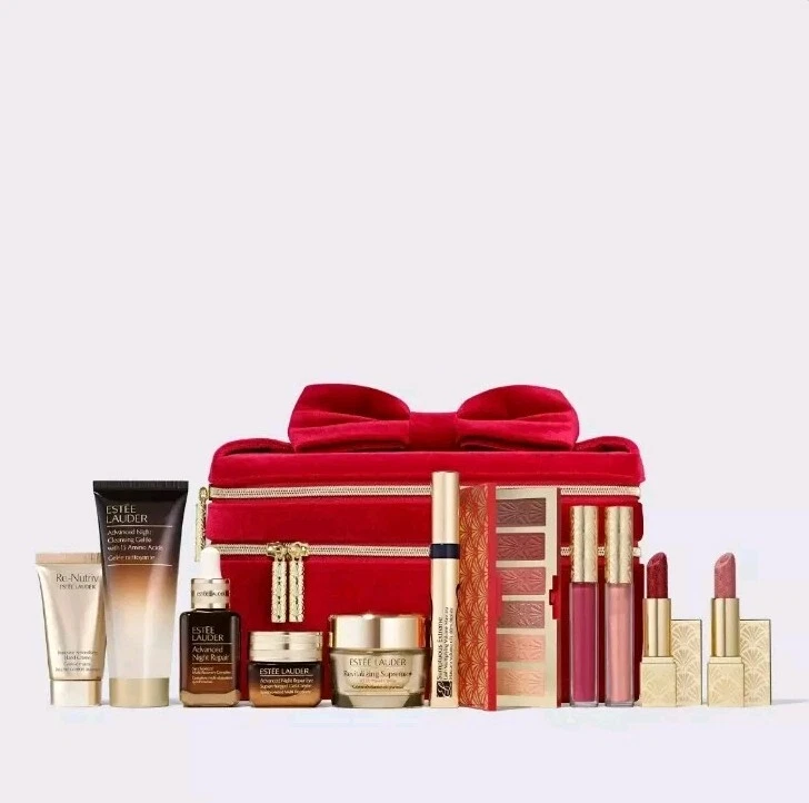 Brand:Estée LauderMakeup Shade:AssortedNumber of Items in Set:12Color:MulticolorCoverage:FullSet Includes:Re-Nutriv Intensive Smoothing Hand Cream 1oz, Advanced Night Cleansing Gel with 15 Amino Acids 2.5 oz, Advanced Night Repair Synchronized Multi-Recovery Complex 1 oz, Advanced Night Repair Eye Gel-Cream 0.5 oz, Revitalizing Supreme+ Youth Power Moisturizing Cream 1 oz, Sumptuous Extreme Lash Multiplying Volume Mascara 0.25 oz, Limited-Edition Trick of The Eyes Eyeshadow Palette 0.24 oz, Lipsticks in Red Velvet and Strictly Confidentia, Lip Glosses in Pink Persuasion and Beneath The Sheen, Train Cosmetics CaseUPC:887167737433Formulation:Cream, Liquidgtin13:887167737433