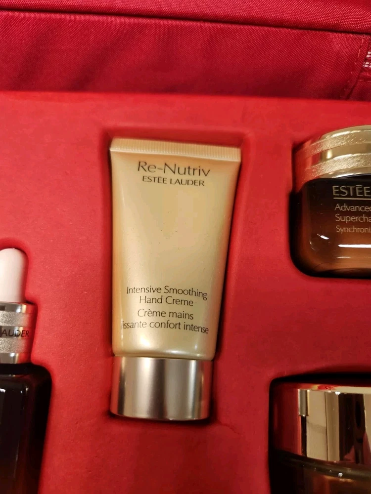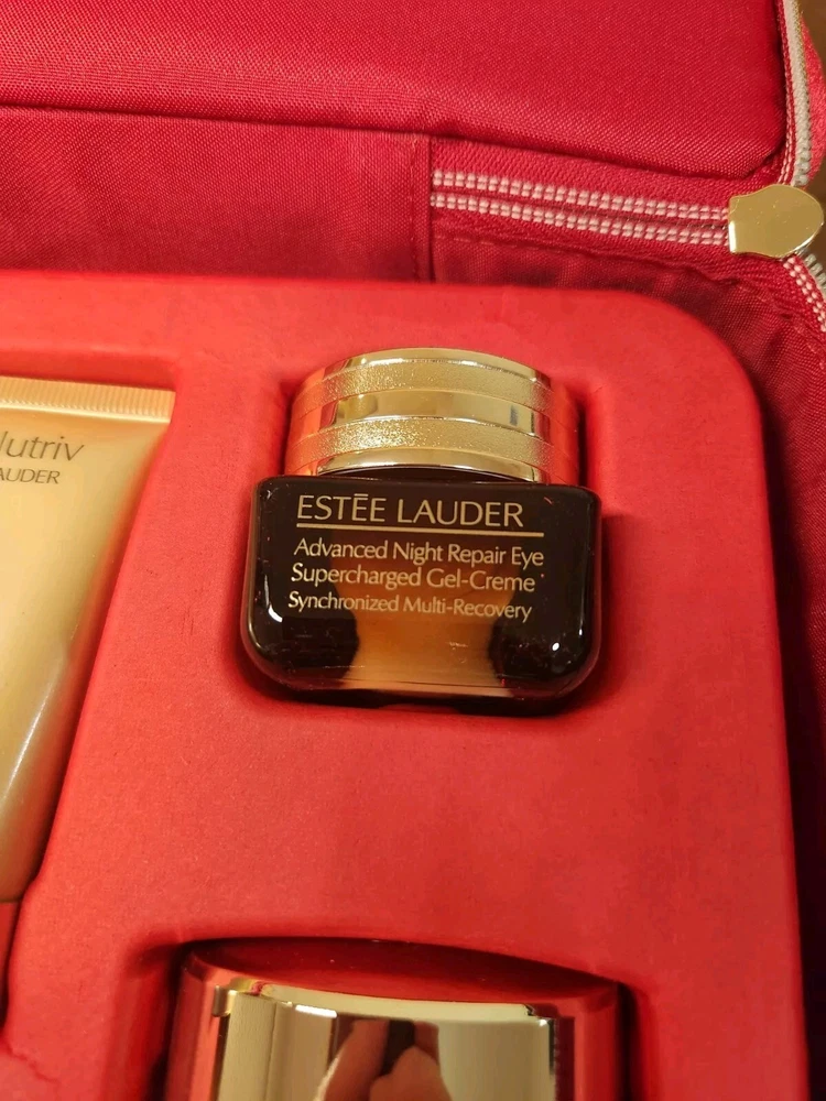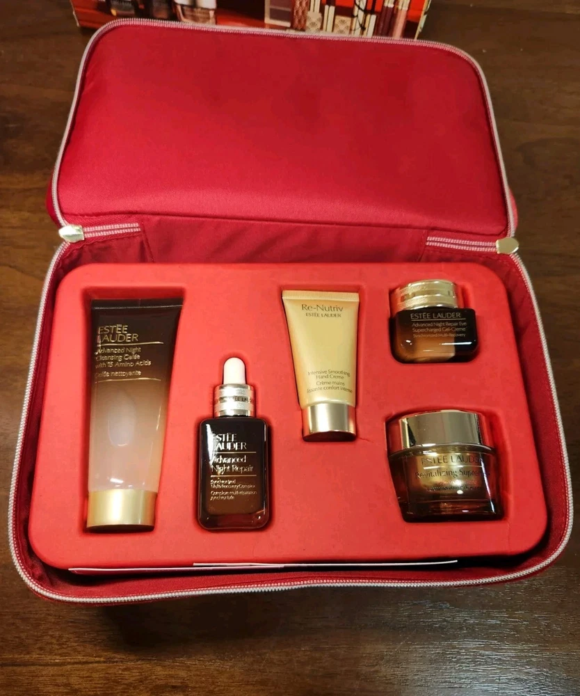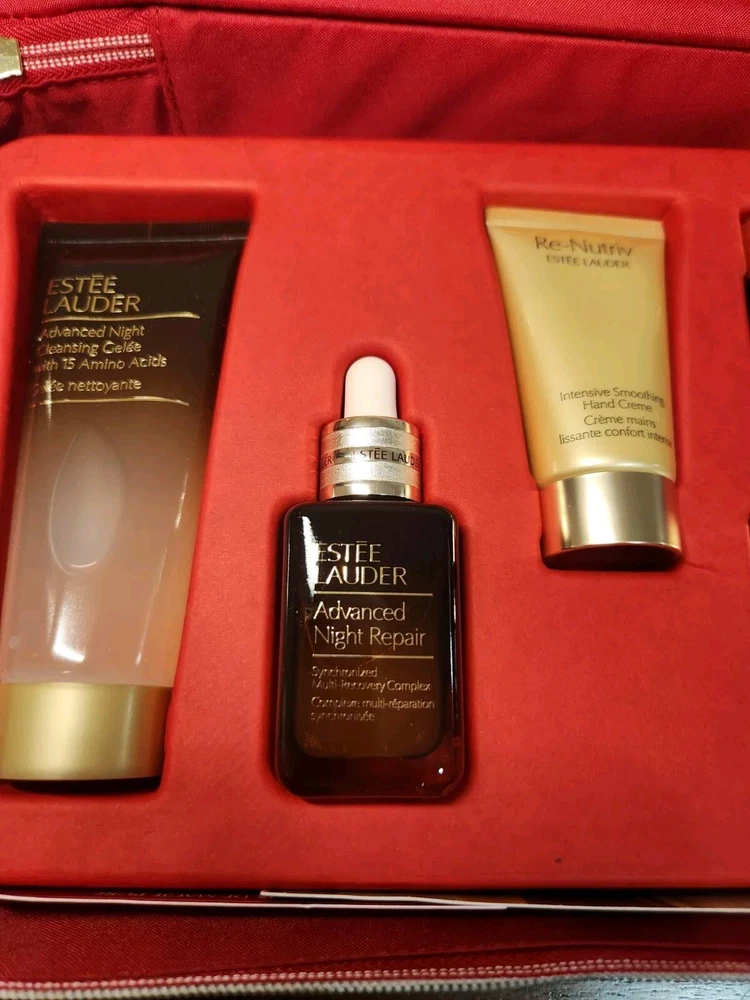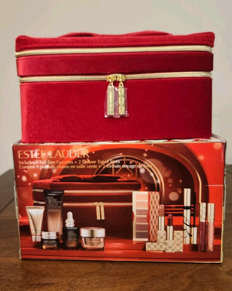 Brand:Estée LauderMakeup Shade:AssortedNumber of Items in Set:12Color:MulticolorCoverage:FullSet Includes:Re-Nutriv Intensive Smoothing Hand Cream 1oz, Advanced Night Cleansing Gel with 15 Amino Acids 2.5 oz, Advanced Night Repair Synchronized Multi-Recovery Complex 1 oz, Advanced Night Repair Eye Gel-Cream 0.5 oz, Revitalizing Supreme+ Youth Power Moisturizing Cream 1 oz, Sumptuous Extreme Lash Multiplying Volume Mascara 0.25 oz, Limited-Edition Trick of The Eyes Eyeshadow Palette 0.24 oz, Lipsticks in Red Velvet and Strictly Confidentia, Lip Glosses in Pink Persuasion and Beneath The Sheen, Train Cosmetics CaseUPC:887167737433Formulation:Cream, Liquidgtin13:887167737433