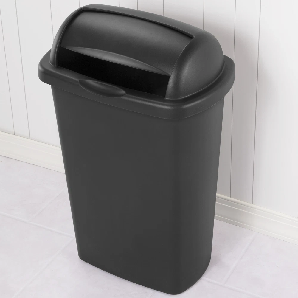 The Sterilite 13 Gallon Roll-Top Wastebasket features a lid that rolls up, stays open and returns closed, all with minimal effort. The large opening allows for disposal of oversized items while leaving the lid rolled up. The design coordinates with any kitchen décor and this wastebasket features an easy-to-clean textured surface. It accommodates a standard 13-gallon trash liner or it can be used to collect recyclable material. This Wastebasket is ideal for all areas of the home including kitchen, garage, basement or even the office. It's durable design will hold up to regular day-to-day use and confidently conceal contents. The overall assembled dimensions of this item are 18 3/8" L x 12 3/8" W x 28 3/8" H. Sterilite Adult 13 Gal. Roll Top Wastebasket Black: Outside Dimensions: 18 3/8" x 12 3/8" x 28 3/8" Large 13 Gallon capacity makes this the ideal size for kitchen use Single unit option Classic color to complement all décor - Black The Sterilite 13 Gal RollTop lid opens with a touch and stays open for easy disposal Lid rolls up, stays open and returns closed with minimal effort Coordinates with any kitchen décor Easy-to-clean textured surface Accommodates a standard 13-gallon trash liner Ideal for use in the Kitchen, Bathroom, Bedroom, Dorm Room, Mudroom or Basement BPA-free and phthalate-free Made of easy to clean No batteries required