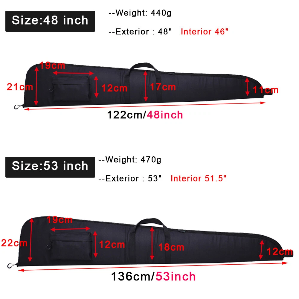 Products Photo Product Description Product Description Soft Rifle Case for Non-scoped Rifles :Constructed with 600D nylon fabric fabric, provides excellent protection for you guns from scratches, dropping and soaking Full-length zipper:Full zipper to allow case to be opened up and lay flat ,easy clean.It has soft Padding to protect the gun from collisions and damage. The gun cases were of fine workmanship and all the details had strong seams.It's also a very fashionable choice. Extra pouch: Rifle bag has a zipper closure outside can storage choke tube ,snap cap ,hunting license,phone,coins and so on. Multifunctional: The gun case for rifle is shockproof and sturdy, perfect for travel, field training, shooting, hunting, tactical activity etc. Friendly Note: The length of the bag we marked is the outside length, not the inside length. There is a difference of 2 inches between the inside and the outside.Please check the size before buying.We hope you enjoy using our products. Size: Size(48inch): 122cm * 21cm [Exterior 48" x 8";Interior 46" x 7.6"] Size(53inch): 136cm * 22cm [Exterior 52" x 8.2";Interior 51.5" x 7.8"] Weight:440g-470g Color: Black Package Includes:1 Piece Rifles Bag( without shoulder strap) Product Details Return Policy About Feadback Return Policy 1. Customer satisfaction is our top goal. We believe our items are so outstanding. All products are quality checked. They are new and in good condition when shipped to our customers. We are convinced you will be happy with your Purchase. 2. If product is defective or damage upon arrival, or wrong product shipped, please contact us immediately. Returns accepted within 14 days of delivery date and item must be in original new condition, not worn or altered in any way with attached tags & wrap. Otherwise deal is final. Return shipping must be paid by buyer. 3. Please contact us first if you have any problems/questions/concerns. We will be happy to resolve any issues you may have in a cordial and friendly manner. 4. We appreciate your Postive Feedback, and will do the same in return. DO NOT leave negative feedback without first communication with us. Please allow max 2 business days for us to response. About Feadback When you satisfied with our product and services please leave us positive feedback. If a problem occurs, contact us immediately with any email request. Just contact us using the " Ask the seller a question" link on eBay.