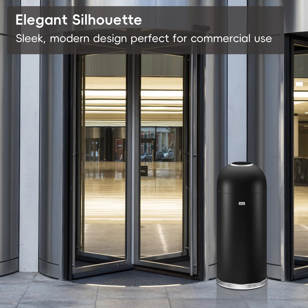 Ideal for High-Traffic Areas: With a generous 15-gallon/56-liter capacity and an open-top design, this sleek and sturdy steel trash can is perfect for both indoor and outdoor commercial spaces, including homes, coffee shops, hotel lobbies, and restaurants. Convenient Wide Open Top: Dispose of garbage without touching the can. The dome shaped open top makes disposal easy while concealing trash away from view. Built to Last: This commercial garbage can is made of thick, heavy-gauge powder-coated steel, which gives it remarkable resilience to wear and tear over time. Classic Silhouette: Featuring a sophisticated, timeless design and a versatile dome-shaped open top, this commercial garbage can adds a touch of style to any setting. Effortless Lift-Off: Outer shell easily removes to access the metal inner liner for quick bag changes while keeping excess trash bag and garbage out of sight. Easy Cleaning: The commercial trash can features an anti-fingerprint, smudge-proof finish, making it incredibly easy to maintain. Simply wipe it with a damp cloth to keep it looking pristine.
