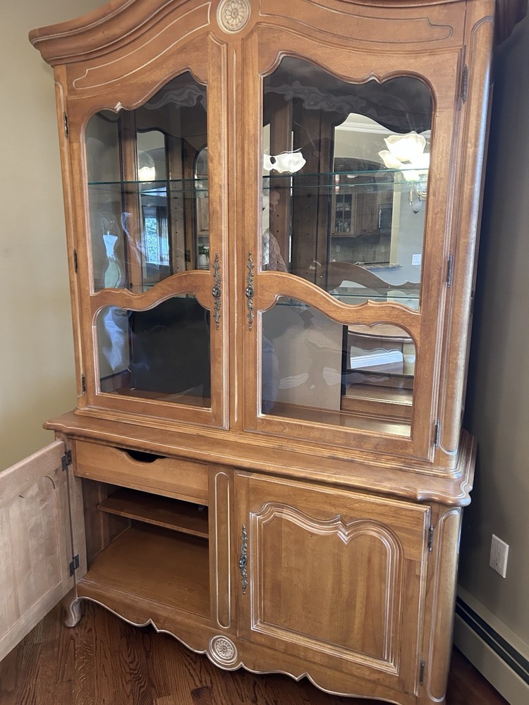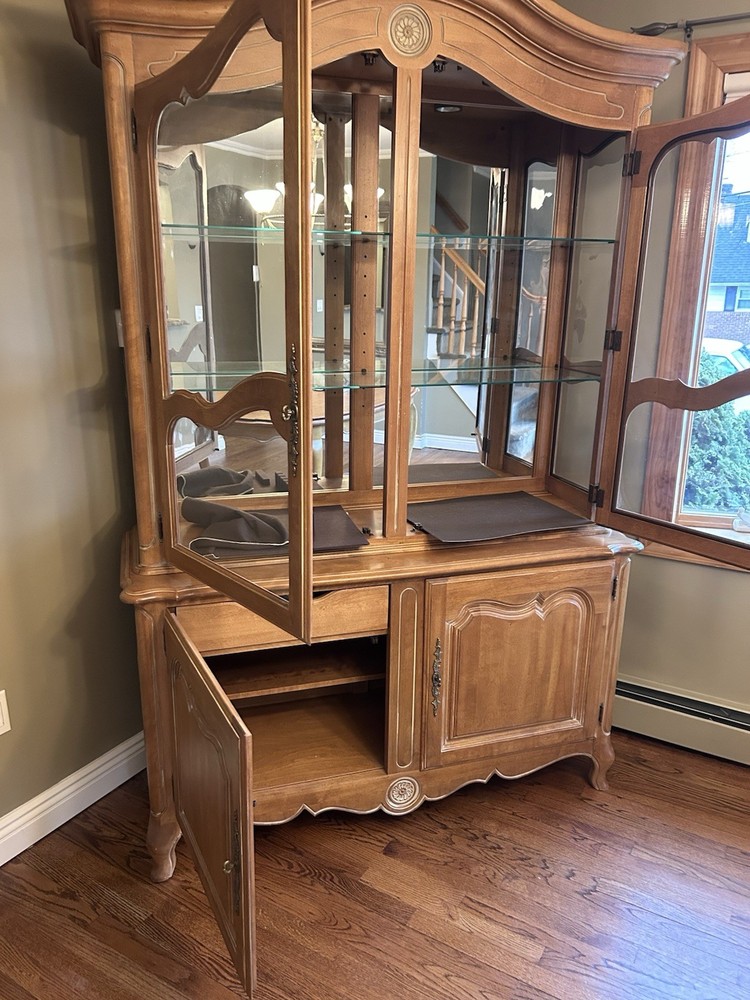 Ethan Allen Legacy Cabinet is a beautiful and functional piece of furniture. The top piece has ornate glass doors, slightly wave glass for added character. Adjustable shelves, mirrored back wall and on/off lighting. The bottom piece has shelves and 2 drawers with removable velvet trays for storage and organizing utensils. This well-crafted solid maple wood cabinet is in excellent condition. Its 2 separate pcs that secure on top of each other. 80 inches high, 60 inches wide and 22 inches deep. **PLEASE NOTE Pick up only NY**