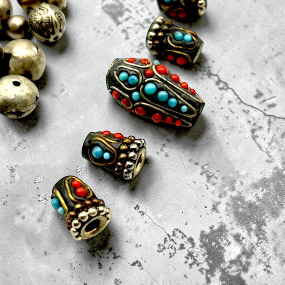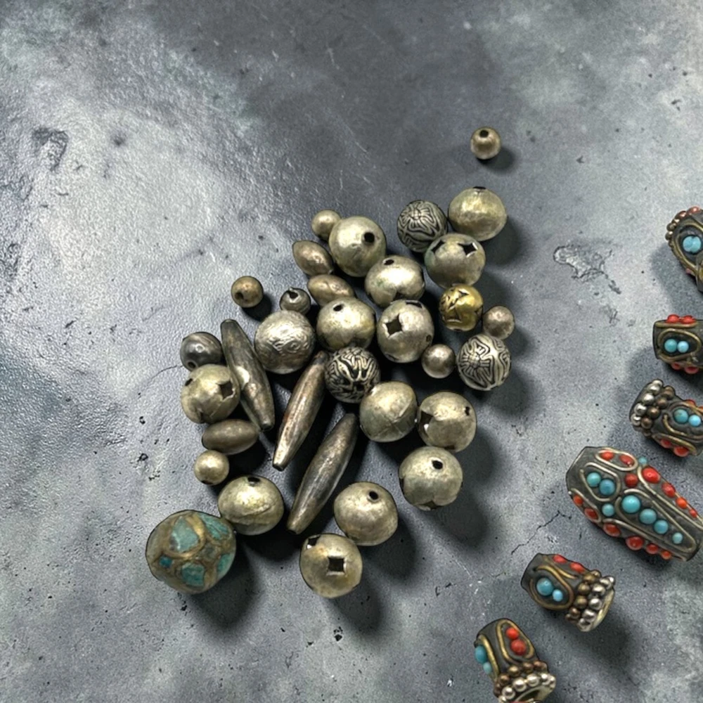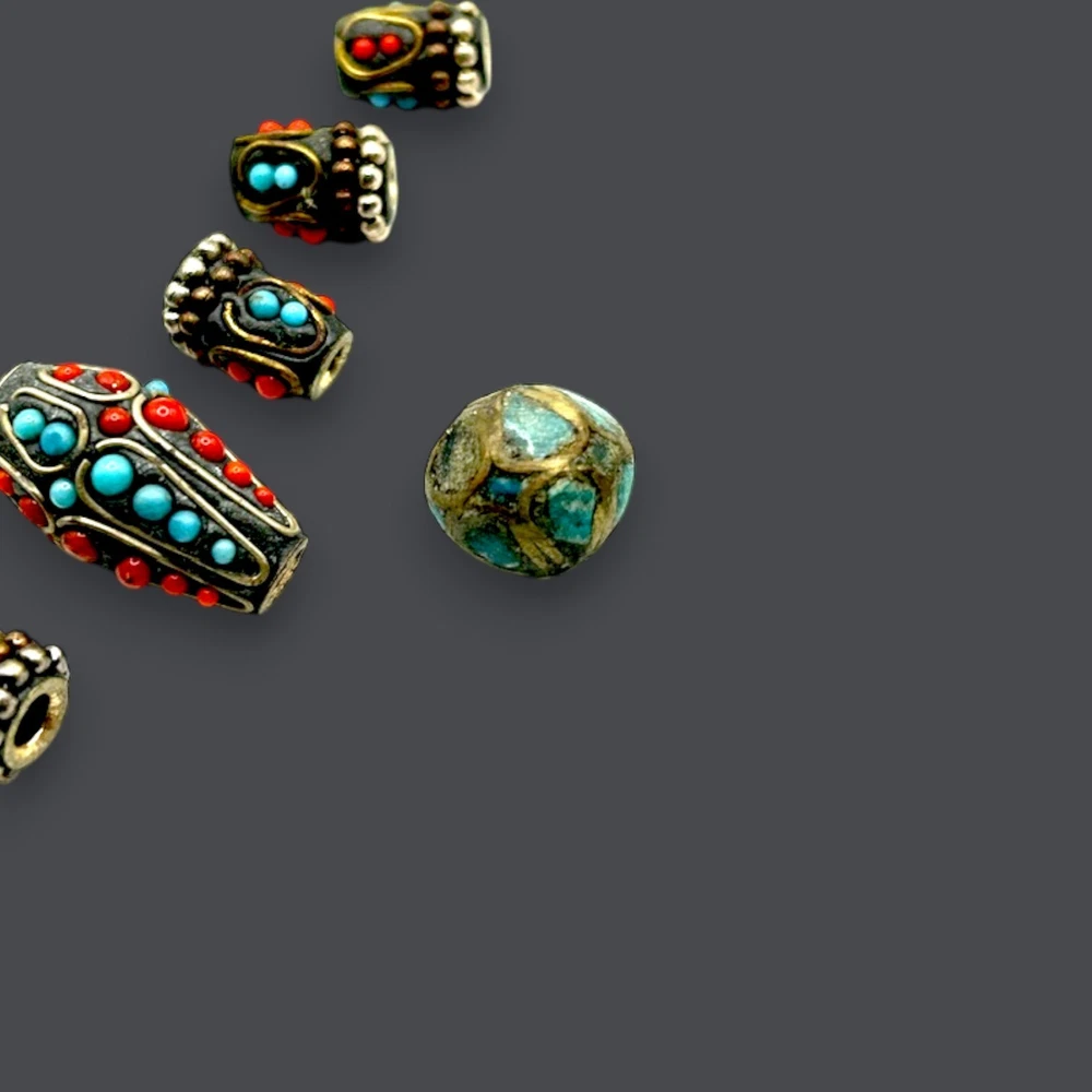 This product is a unique collection of Tibetan clay coral & turquoise beads, and a nice collection of ethnic silver vintage beads, perfect for jewelry making. The beads are loose and handmade, adding a touch of authenticity and cultural flair to any jewelry creation. The combination of the natural beauty of the turquoise stone with the traditional craftsmanship of the Tibetan clay and ethnic silver beads makes for a versatile and eye-catching selection for jewelry enthusiasts and crafters alike. I am not sure of the silver bead origin, they are light and hollow, there is a total of 39 beads in this collection. The beads have not been cleaned and will probably look quite nice when they are all buffed up. total.