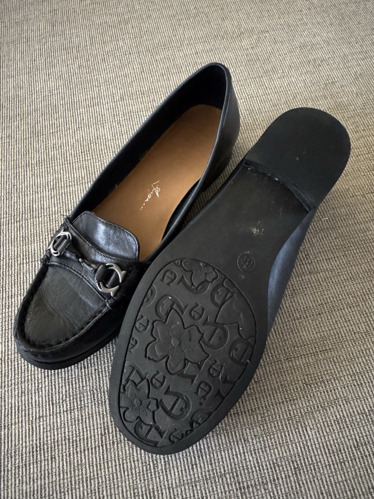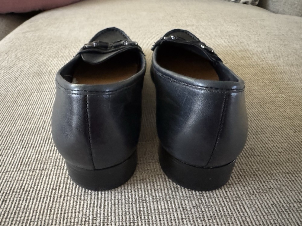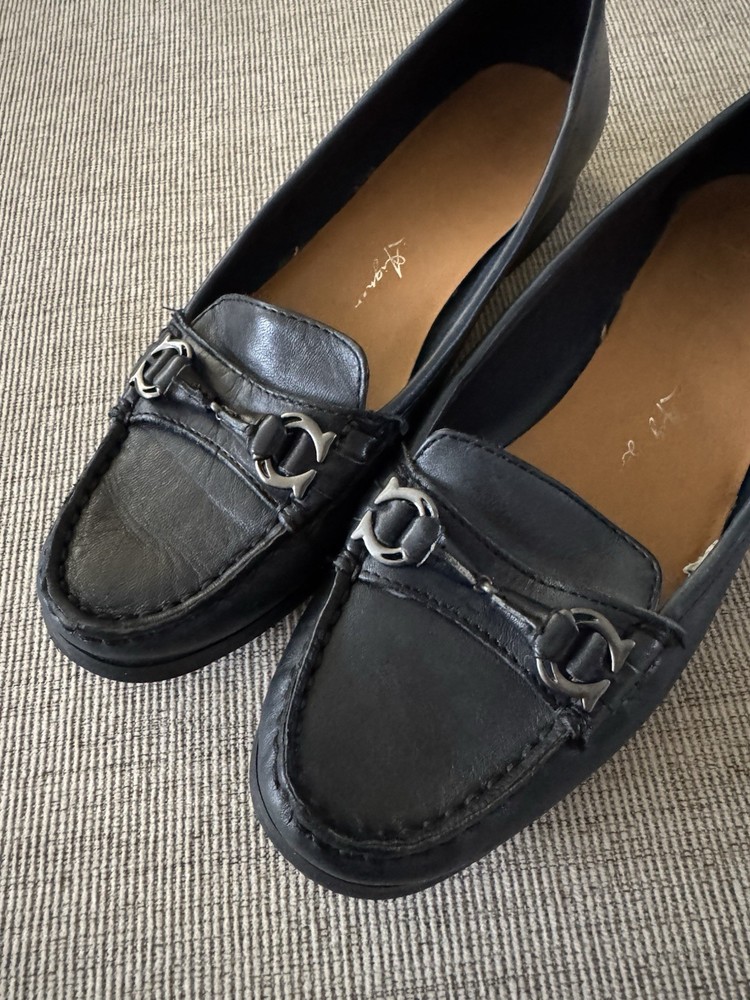 The Etienne Aigner Luxe Women's Black Leather Horse Bit Horsebit Elsie Loafers in size 6.5 are a stylish and high-quality pair of shoes perfect for any woman's wardrobe. These loafers feature a classic black color with a unique horse bit design, adding a touch of elegance to any outfit. Made from premium leather, these flats are both durable and comfortable, making them a versatile option for everyday wear or special occasions. The iconic Etienne Aigner brand ensures both style and sophistication in every step.