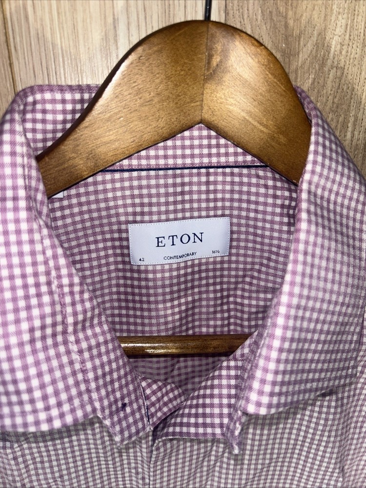 The Eton Contemporary Men’s 42 16.5 Purple Check Button Up is a stylish and sophisticated dress shirt made from a luxurious Tencel cotton blend. This shirt features a regular fit and a classic check pattern, perfect for a polished and put-together look. The purple color adds a pop of personality to the classic design, making it a versatile and chic addition to any man's wardrobe.