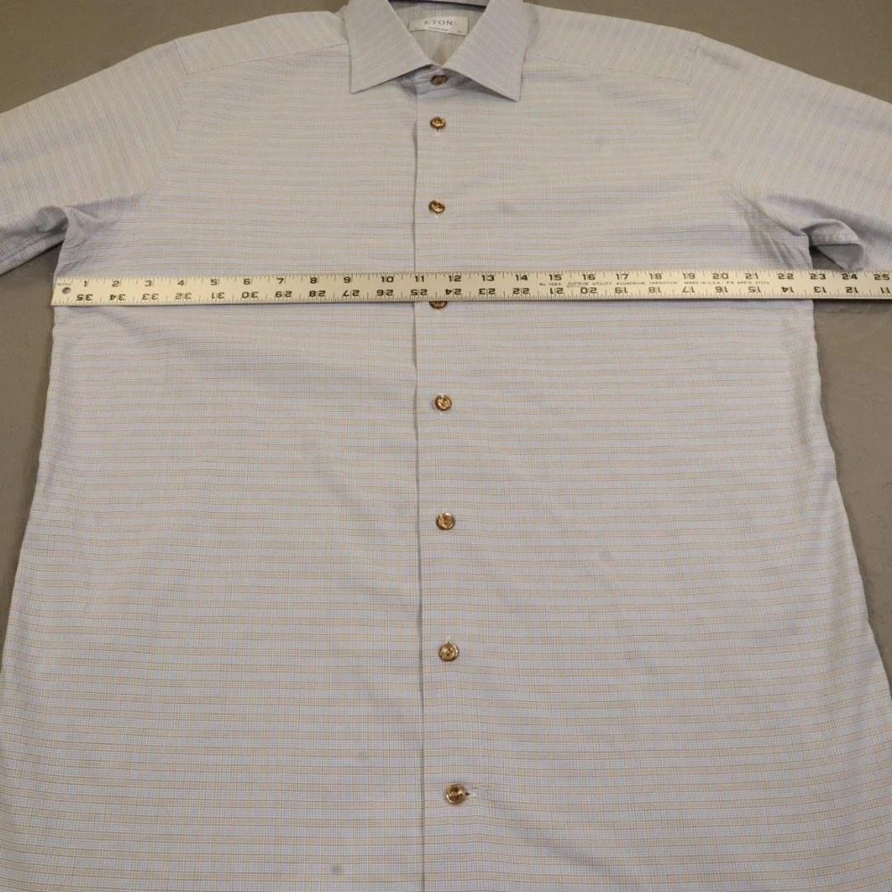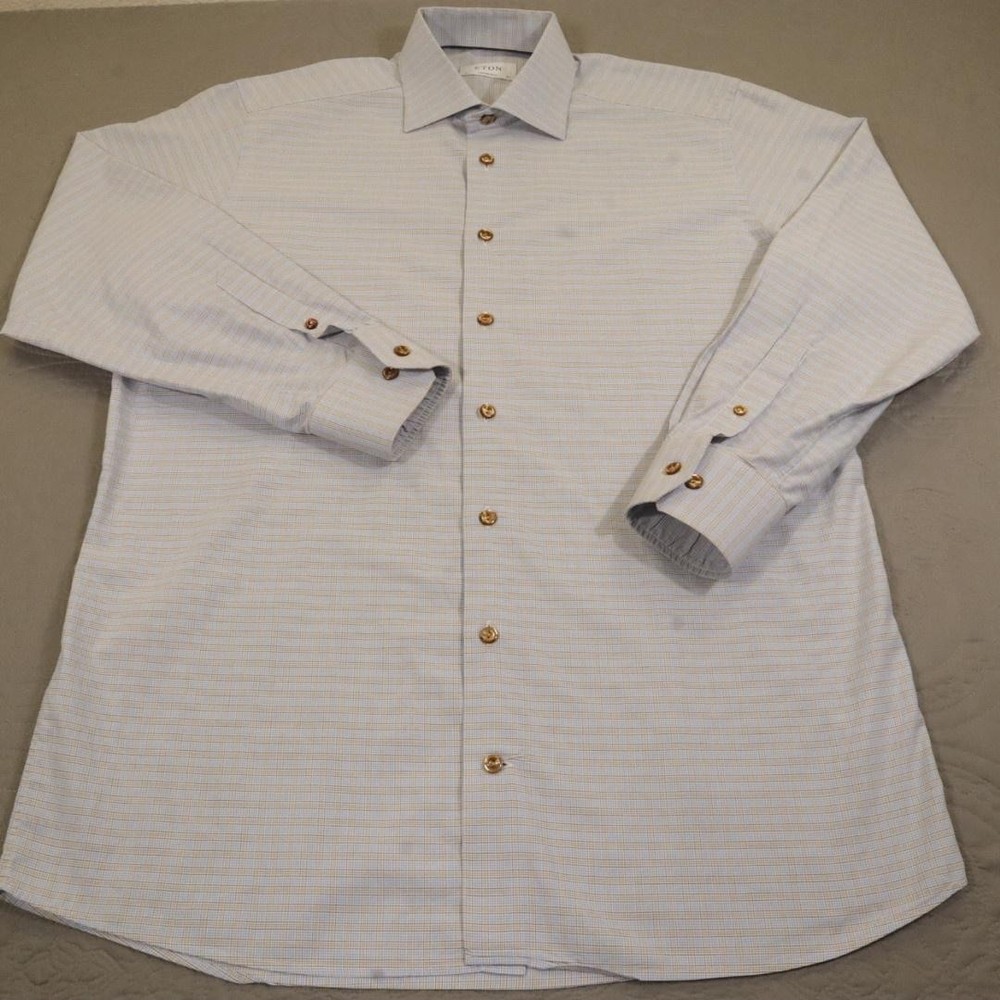 Brand: Eton Style: Mens long sleeve dress shirt in the Contemporary fit with spread collar and button front. Color/Pattern: Light blue base with tan and brown micro check plaid and contrasting brown buttons. Tag size: 42 / 16.5 neck, 34/35 sleeve; contemporary fit with a regular tailored silhouette. Material: 100% cotton twill