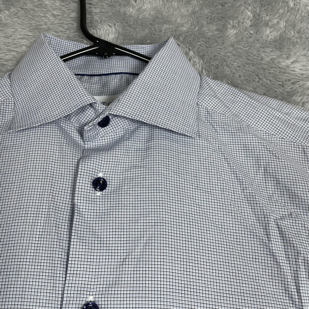 Eton Shirt Mens 15.5 Slim 39 Blue Micro Check Dress Button Up Long Sleeve Condition: Good, gently worn. No obvious stains, holes, or flaws. Some light wrinkling from storage—may need ironing before wearing. Features a sharp blue micro check pattern with spread collar and contrasting dark buttons for a refined business or dress attire look. Material: 100% cotton (see care label photo) Tag Size: 39 (15.5) Slim Fit Made in Romania, Europe Brand: Eton (as seen on neck tag and internal care labels) Style/Model: 1000104242739, 878858, CA52439 Color: Blue with micro check grid pattern Timeless style perfect for dress occasions, office wear, or professional settings