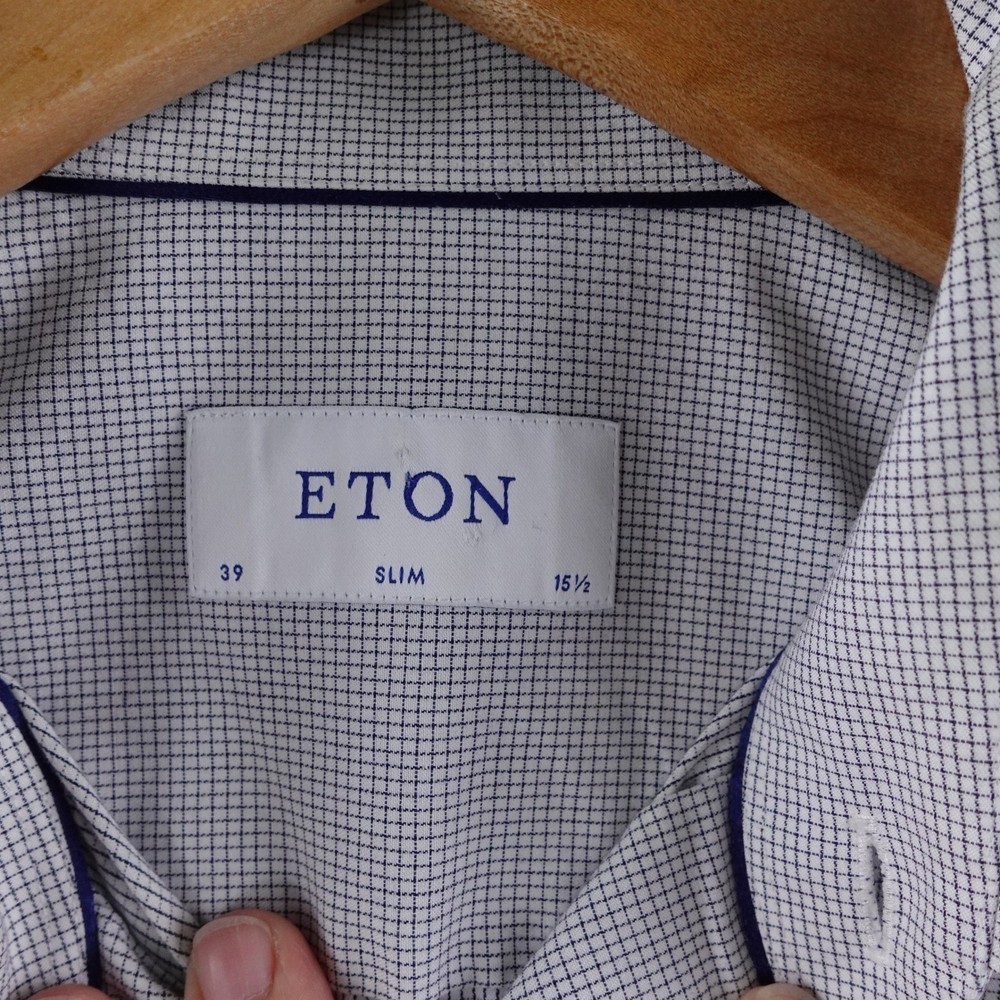 Elevate your professional wardrobe with this sophisticated Eton slim fit dress shirt. The crisp fabric features a subtle yet eye-catching purple grid check pattern, offering a refined touch to your ensemble. Designed for a modern silhouette, this shirt boasts a sharp collar and smooth button-front closure, ensuring a polished appearance from the boardroom to evening events. Perfect for business meetings or a smart casual dinner. Department: Men Fit: Slim Sleeve Length: Long Sleeve Type: Dress Shirt Pattern: Check Collar Style: Spread Material: 100% Cotton Top Cuff Style: Barrel Cuff Features: Easy Care, Non-Iron Neckline: Collared Closure: Button Fabric Type: Woven Accents: Button Occasion: Business, Workwear Keywords: Eton, dress shirt, slim fit, grid check, long sleeve, button up, men's fashion, business casual, workwear, tailored, classic, formal