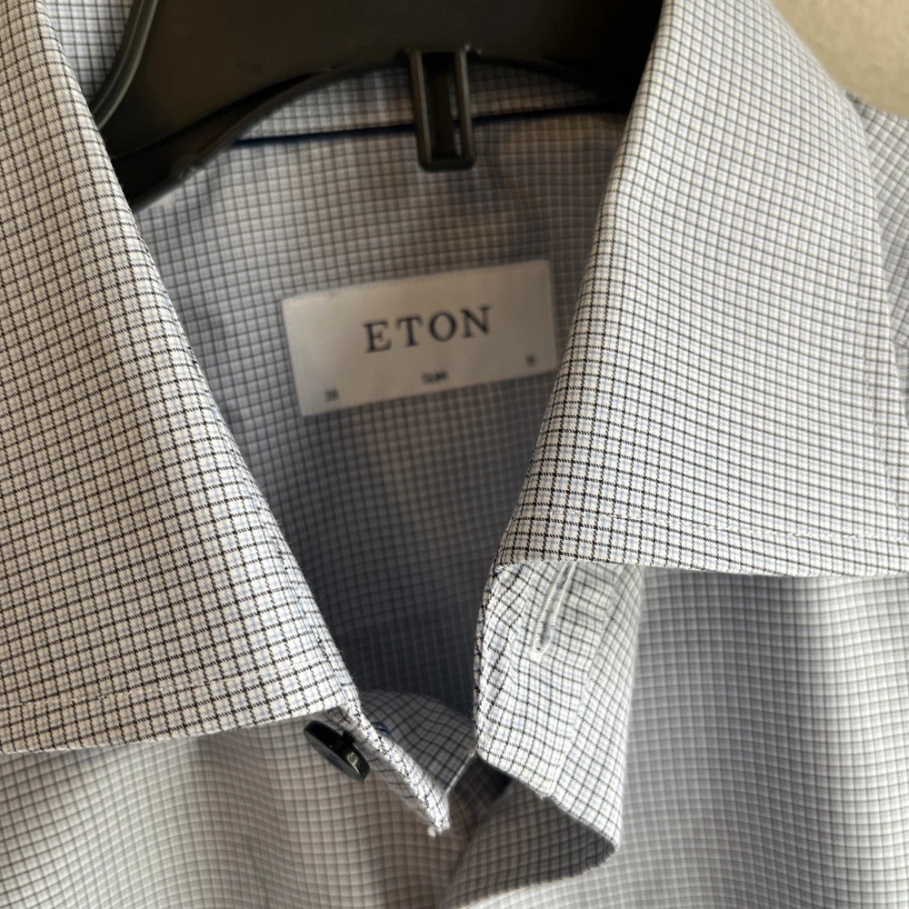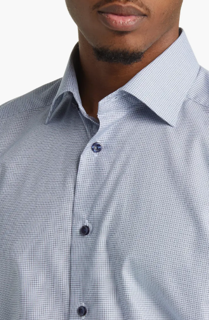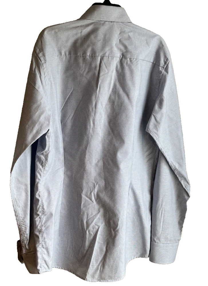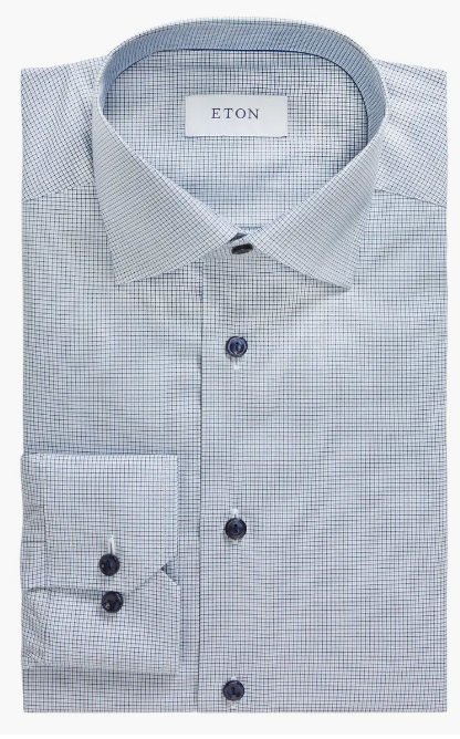 Eton men's Slim Fit Microcheck Dress Shirt size: 15 / 38 color: Blue Spread collar with permanent collar stays Convertible cuffs slim fit The Eton tag is removed - the Bloomingdales price tag is attached 100% cotton Machine washable retail $275 underarm to underarm 19.5" collar seam to bottom 30.5" R631