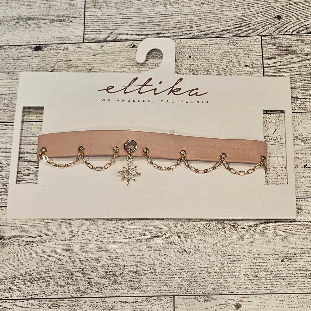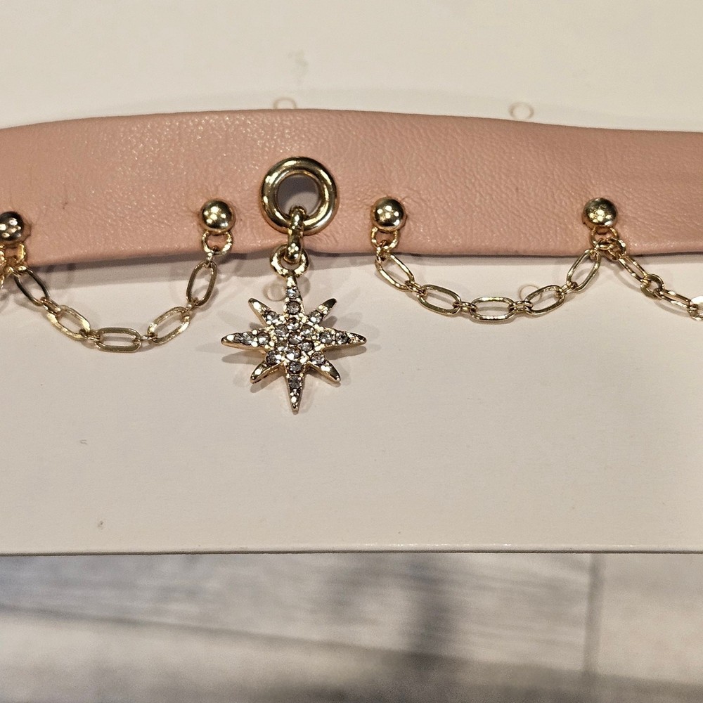 Ettika Sleeping Beauty Pink Leather Choker Necklace Star Charm Celestial Boho Who needs a knight in shining armor when the Ettika Sleeping Beauty Pink Leather Choker Necklace is around?! This pink genuine leather choker has gold studs, dangling chain, and a rhinestone encrusted star charm at center. Necklace measures 10" around with a 5" extender chain. Genuine leather. Gold-plated. Balance man made materials. Lobster clasp closure. Adjustable New with tags, no flaws. Sold at Lulus. Smoke free, dog friendly home. sun stars celestial boho bohemian editorial fantasy fashion twee quirky cottage rock punk concert