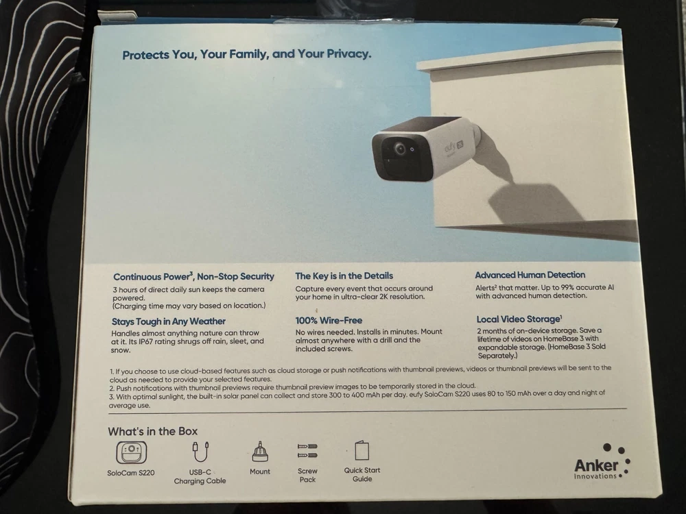 Enhance your outdoor security with the Eufy SoloCam S220, a 2K Wi-Fi Solar Bullet Camera that delivers high-resolution imagery both day and night. Its robust features include automatic motion tracking, digital zoom, and a 360° rotation for comprehensive coverage. The camera's color mode switches seamlessly between vivid daytime video and crisp black-and-white night vision, ensuring clear footage even in low light.Designed to withstand the elements, the SoloCam S220 is weatherproof, making it ideal for any outdoor setting. The solar-powered camera also comes with a rechargeable battery, offering peace of mind with its ability to store up to 8 GB of footage. Integration with smart home systems like Google Assistant and Amazon Alexa allows for voice commands and notifications, adding convenience to your security setup.