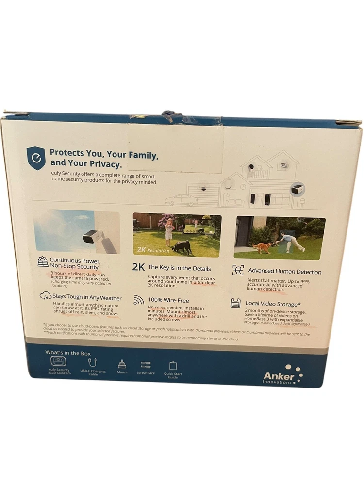 Introducing the Eufy SoloCam S220 2K Wi-Fi Outdoor Solar Bullet Camera in White. This top-of-the-line security camera is designed for outdoor use and comes with a range of impressive features. With its wireless, infrared, and Wi-Fi connectivity, you can easily monitor your property from anywhere. The camera has a maximum resolution of 2304x1296 and operates at a noise rating of 75 dB. It also comes with a storage capacity of 8 GB and is compatible with Google Assistant and Amazon Alexa. The Eufy SoloCam S220 is weatherproof and waterproof, making it perfect for outdoor use. Additionally, the camera has a flashing LED and a night vision feature, allowing you to keep an eye on your property at all times.