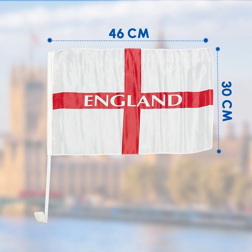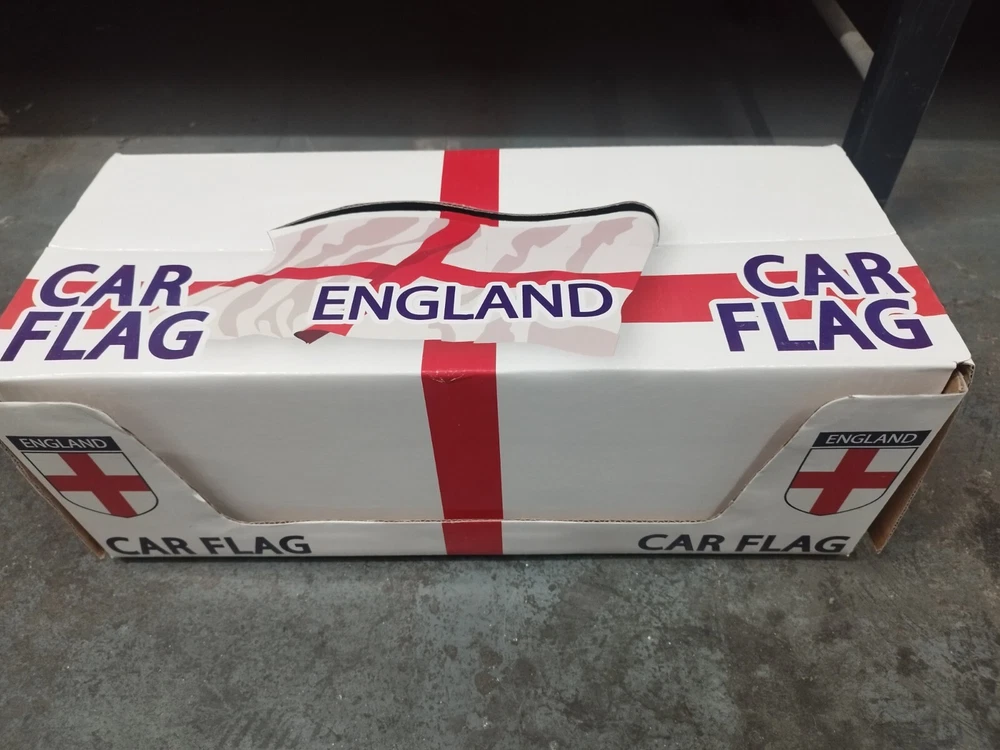 You will receive 2 boxes, each box contains 48 flags individually wrapped. A total of 98 single window car flags featuring St George's cross flag and ENGLAND wording in the middle.