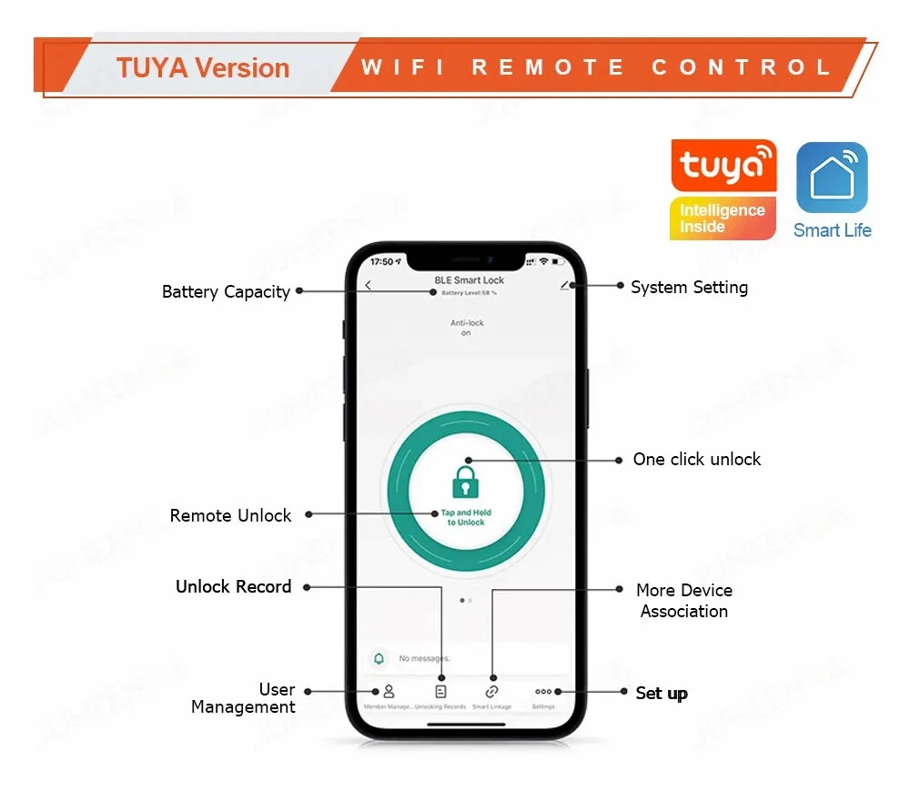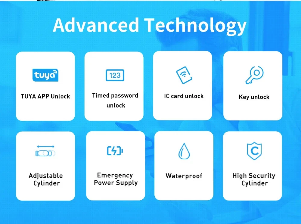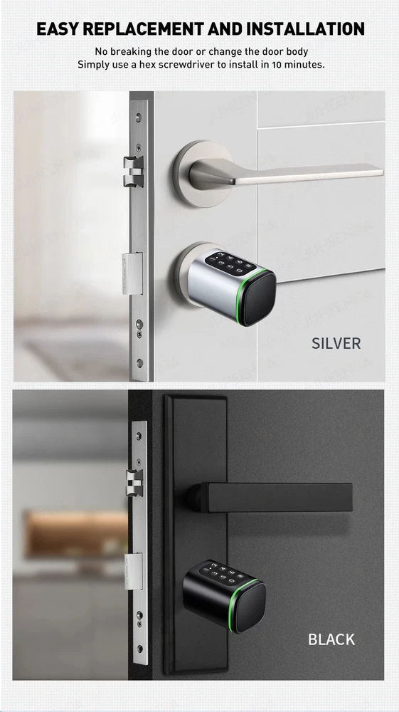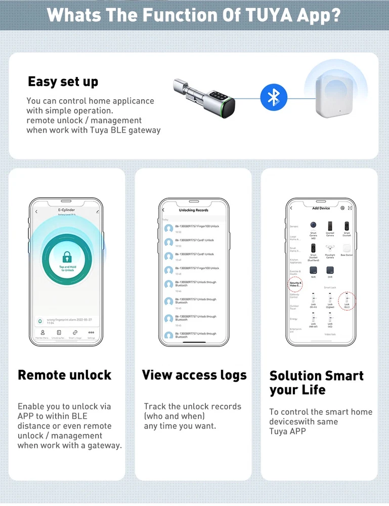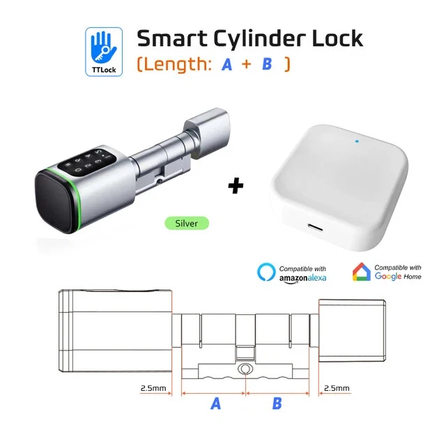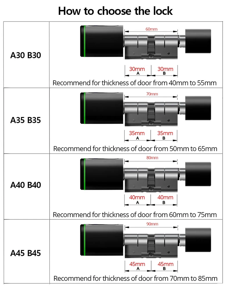 Euro Door Smart Cylinder Lock Tuya Bluetooth APP Digital Password Card Mechanicak Key TTlock Unlock Home Electronic Smart Lock Core Specification Material: 304 stainless steel + Aluminum + Plastic Color: Black, Silver 4 Unlock Ways: Password, Card, Metal Key, Tuya App ( Bluetooth ), TTlock App Lock Cylinder Size: 60mm, 70mm, 80mm, 90mm, 100mm,110mm Door Thickness: 60-110 mm Power Supply: Powered by 1pc CR123A battery ( Not included, customer should buy themself ) Emergency Power Supply: With Micro Type-C USB Charging Supported by Tuya App Tuya App is an smart lock app, its multiple functions always satisfy your requirements ● Manage fingerprint, card,APP user ● View access logs ● Check alarm and unlock record ● The language of the APP follows the mobile phone system ..etc. ● Tuya options with gateway , The smart lock can connect to WiFi. TT lock APP Functions: 1.The lock connect with the phone by Bluetooth. 2.Send temporary/ekey password remotely 3.You can open the lock / manage the lock (add user / delete user / set password and so on) 4.Add a G2 gateway if WiFi connection is required (Gateway buy extra)Connect Alexa through G2 gateway Gateway Connection method The lock can be connected directly with the bluetooth of the mobile phone The gateway can make it connect to wifi and compatible with Alexa and Google home ● Order TT Lock options with gateway G2. The smart lock can connect to WiFi and control by intelligent voice system with other smart home devices to achieve smart home. Details and Batteries This cylinder lock is an advanced smart lock offering Airbnb integration and high-tech automated features. The automatic lock feature can adjust the time for the ultimate security setting. The long life battery ensures the quality utilizing. ◆ How to judge whether it is suitable 1. The lock cylinder type is the same, 2. The size of the lock cylinder is the same or smaller How To Install? ●Simply use a screwdriver to install in 3 minutes ●No breaking the door or change the door body Packing Included Smart Cylinder Lock x1 Smart IC Card x 2 Mechanical Key x 2 Use Manual x1 Screw Bag x1 If you have many family numbers, and want more IC cards, pls Contact us freely!