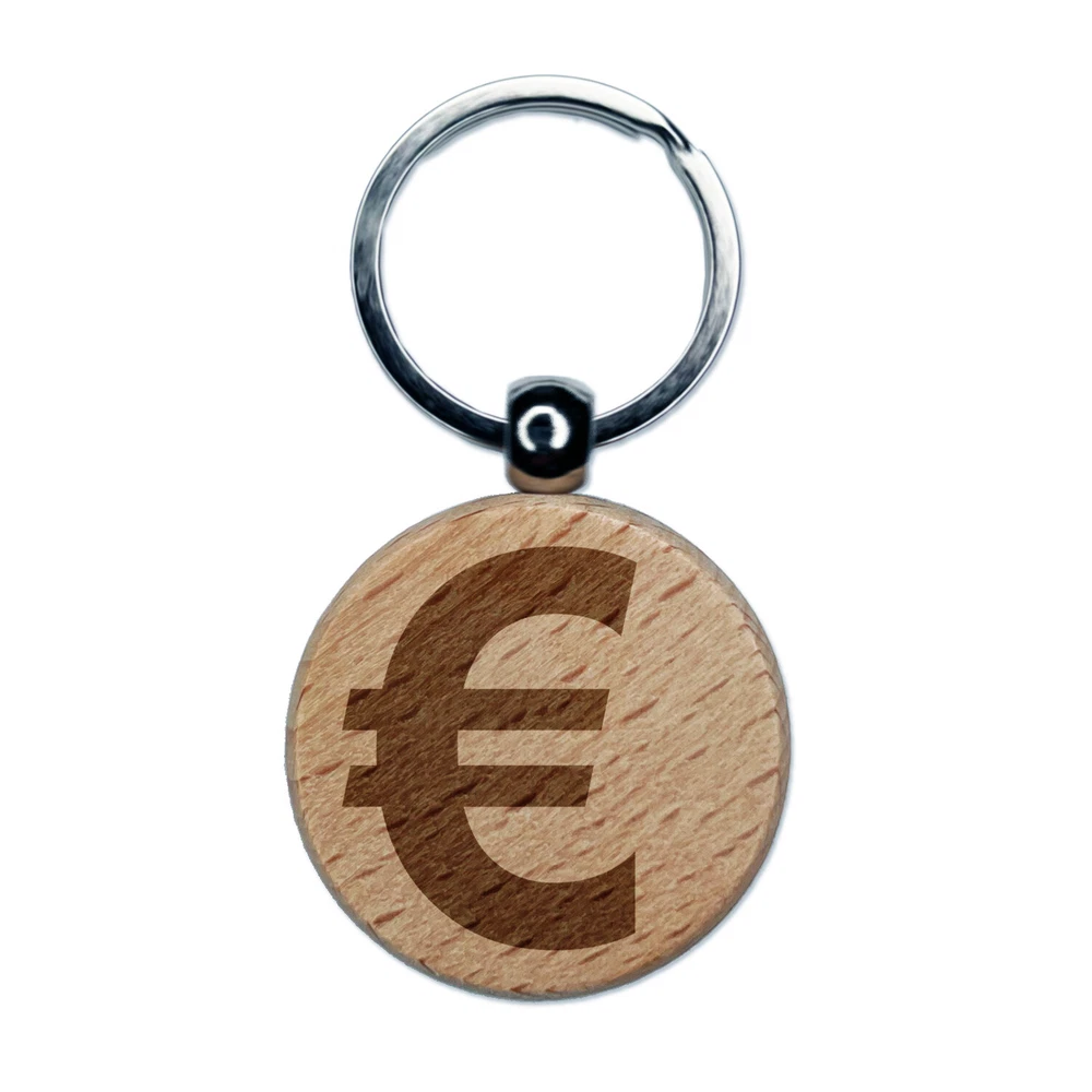 Euro Symbol Engraved Wood Round Keychain Tag Charm