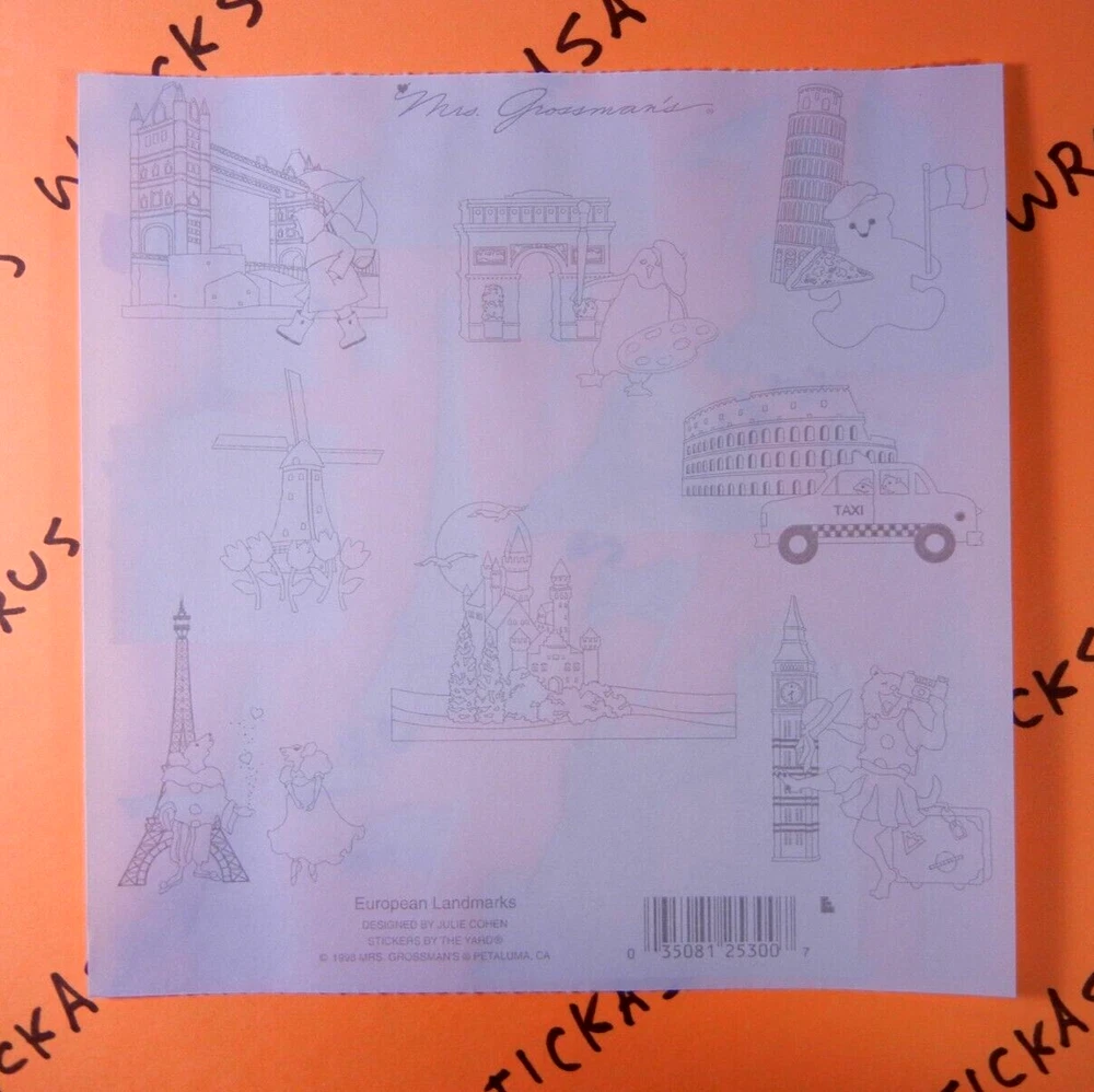 Sticker Sheet Is Vintage New. Sticker Brand Is Mrs. Grossman's. Sticker Sheet Is 6" x 6". Sticker Theme Is European Landmarks. When Purchasing Multiple Sticker Sheets Or Packs Please Add All Items To Cart Before Purchase So That Your Purchase Combines Down To Base Shipping Price. All items are shipped WITHOUT tracking in an envelope with cardstock.