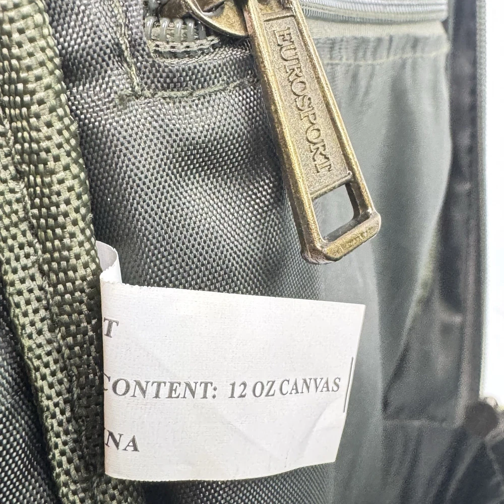 Fabric Type: Canvas Theme: Army, Retro, School Features: Adjustable Strap, Cross-Body Strap, Inner Pockets, Outer Pockets, straps zip apart to make it wearable as a backpack, Zippers meet at top and can be locked together Bag Height: 13 Color: Green Brand: Eurosport Handle/Strap Material: Faux Leather Closure: Zip Style: Backpack Material: Canvas Bag Depth: 3 in Personalize: No Occasion: Casual, Travel Pattern: Solid Handle Style: Crossbody Strap Size: Medium Department: Unisex Adults Bag Width: 9.5 Seller Notes: “Condition is like new. Appears never used.”