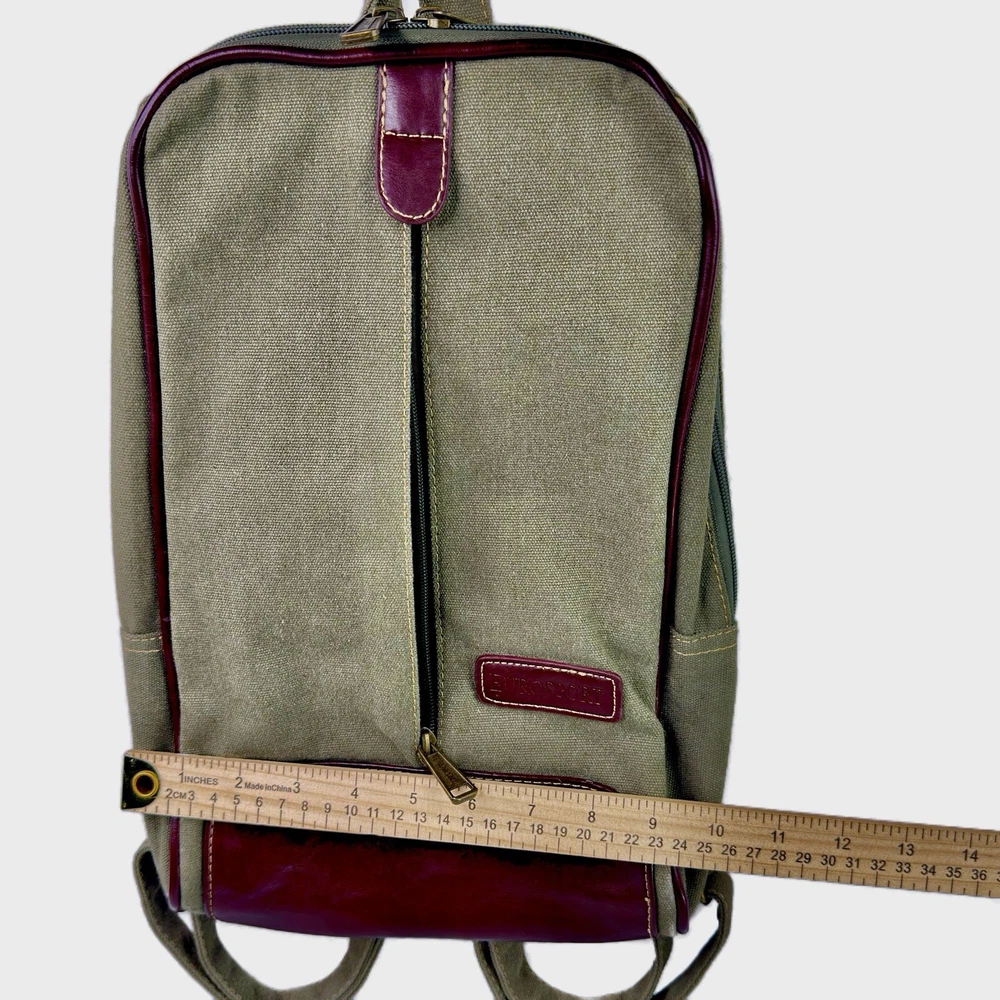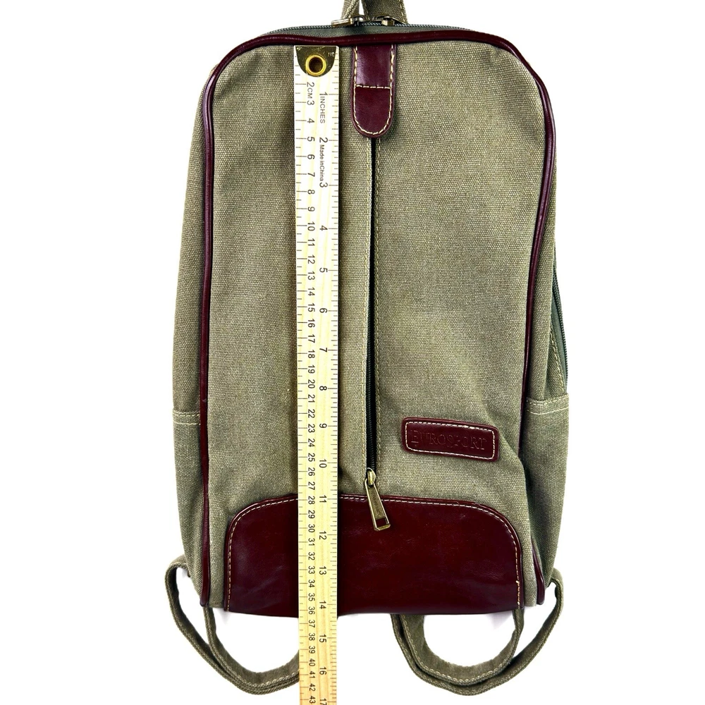 Europort Green & Brown Canvas Sling Shoulder Backpack Bag Purse 13" Eurosport sling style bag. The straps zip apart to make it wearable as a backpack. Measures approximately 13.5" tall, 3" deep, 9.5" wide. The central compartment has a zip pocket and two slip pockets. The front has a long zip pocket. (can hold Ipad Mini size device) Hook for hanging. Adjustable straps. Strap zips apart and can be worn as a backpack. Zippers meet at the top and can be locked together to prevent theft. Unisex. Condition is like new. Appears never used. ⭐Smoke and pet-free ⭐Examine photos carefully as they are part of the description. ⭐Ships quickly - same or next business day!