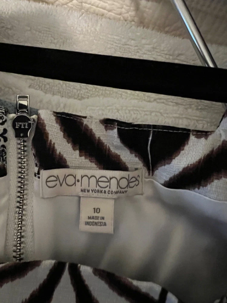 This stunning Eva Mendes dress is a must-have for any fashion-forward woman. The unique ethnic design in black, brown, and white, along with the square neckline and sleeveless fit, make it perfect for a variety of occasions, from travel to business to parties. The dress is made from a comfortable and breathable blend of cotton and woven linen, and it features a zipper closure and pockets for added convenience. The knee-length dress has a fit and flare style that is flattering on any body type, and it comes in size 10. The dress is machine washable and easy to care for, making it a practical addition to any wardrobe. Whether you're dressing up or down, this dress is sure to turn heads and make you feel confident and stylish.