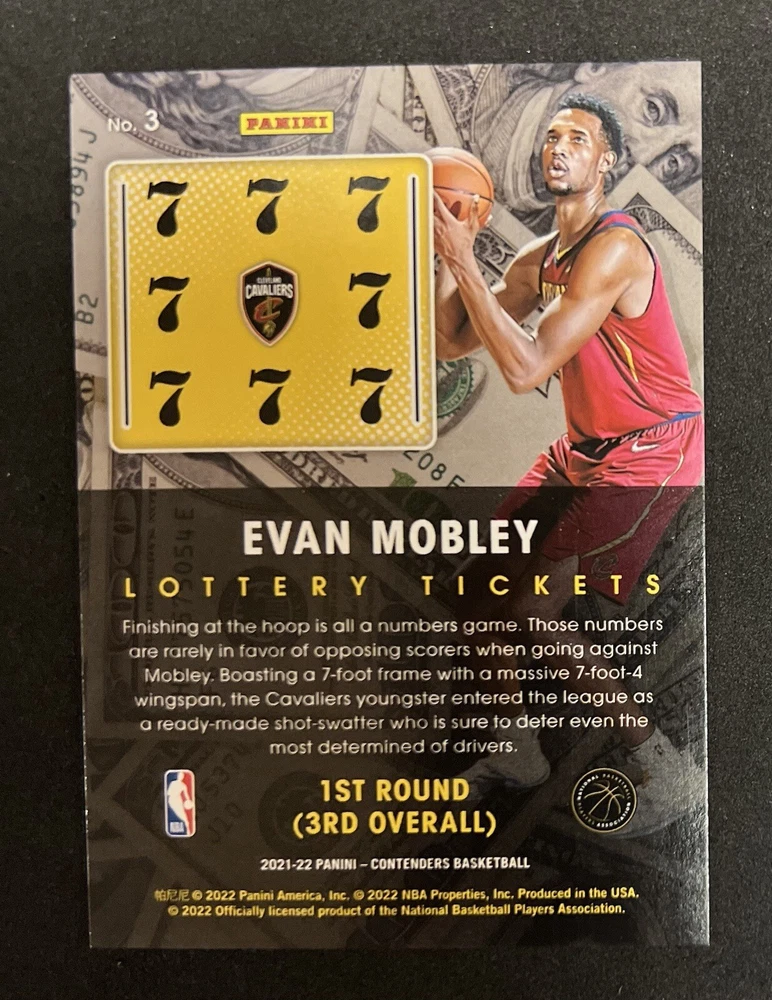 Athlete: Evan Mobley Original/Reprint: Original Season: 2021-22 Player/Athlete: Evan Mobley Features: Rookie Year: 2021-22 Product: Single-Insert Card Name: Evan Mobley Manufacturer: Panini America, Inc. Franchise: N/A Card Manufacturer: Panini America, Inc. Year Manufactured: 2021 Sport: Basketball Card Attributes: Rookie Set: 2021-22 Panini Contenders - Lottery Ticket Team: Cleveland Cavaliers Type: Sports Trading Card Card Number: 3 Player: Evan Mobley Parallel/Variety: [None]
