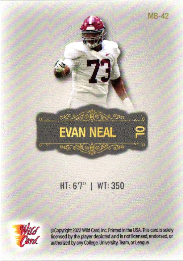 Evan Neal 2022 Wild Card Matte # MB-42 Alabama Crimson Tide All card orders under $20 will ship Ebay Envelope with tracking unless noted. Orders over $20 will ship USPS Ground Advantage. All of my cards are listed as Near mint or better, unless I can tell with my naked eye there is something wrong with the card. I am not a professional card grader. I do not guarantee any centering. I scan all card photos to load large amounts of cards to Ebay. Unfortunately sometimes photos show lines that aren't really on the cards. Please send me a message if you have a question about the condition of the card. Please send me a message before leaving negative feedback. I'll do my best to rectify any issues thay may come along.