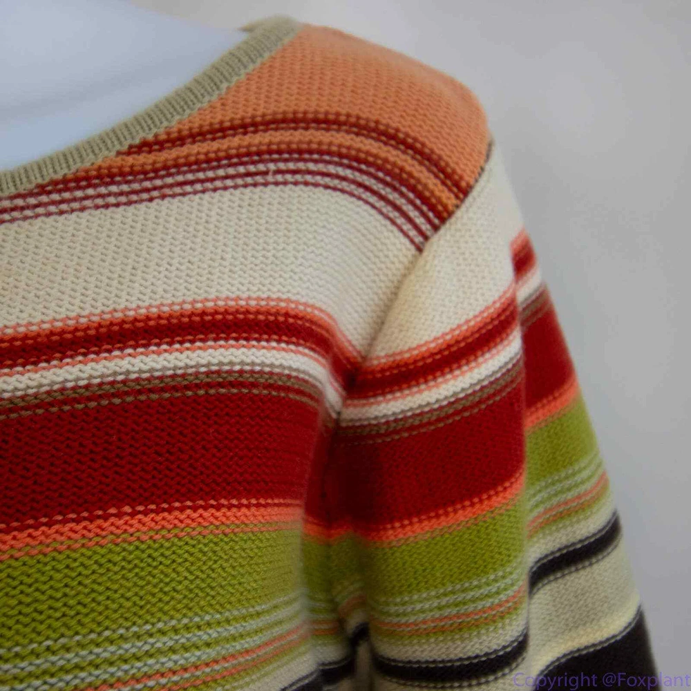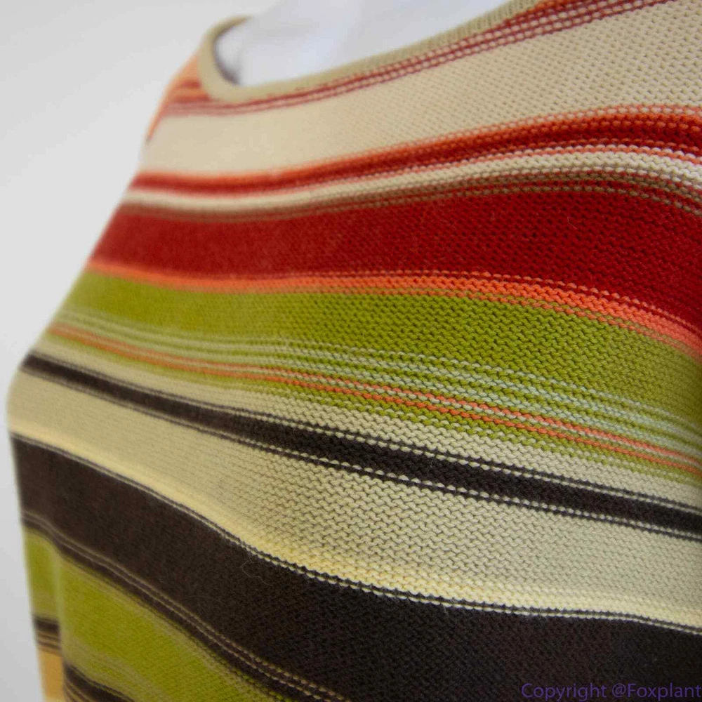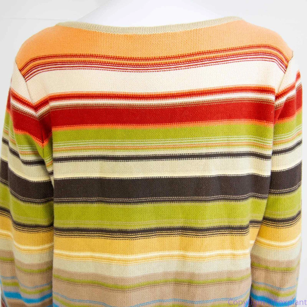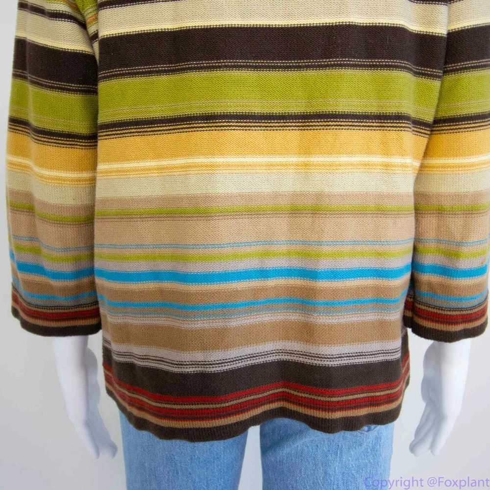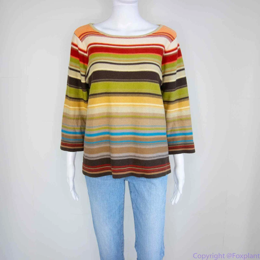 Evan Picone 100% cotton multi-color stripes sweater, women's size L 100% cotton multi-color stripes 3/4 quarter sleeves boat neck Color: red, orange green, gray, beige, yellow, blue. Very colorful. Size L , please check approximate laid flat measurements: Shoulder(seam to seam): 15 3/4'' Bust(armpit to armpit): 21 1/4 '' Length (from high point of shoulder down): 23 3/4'' Sleeve(shoulder seam to hem): 17 3/4 '' Excellent condition. No noticeable flaws or stains or damages.