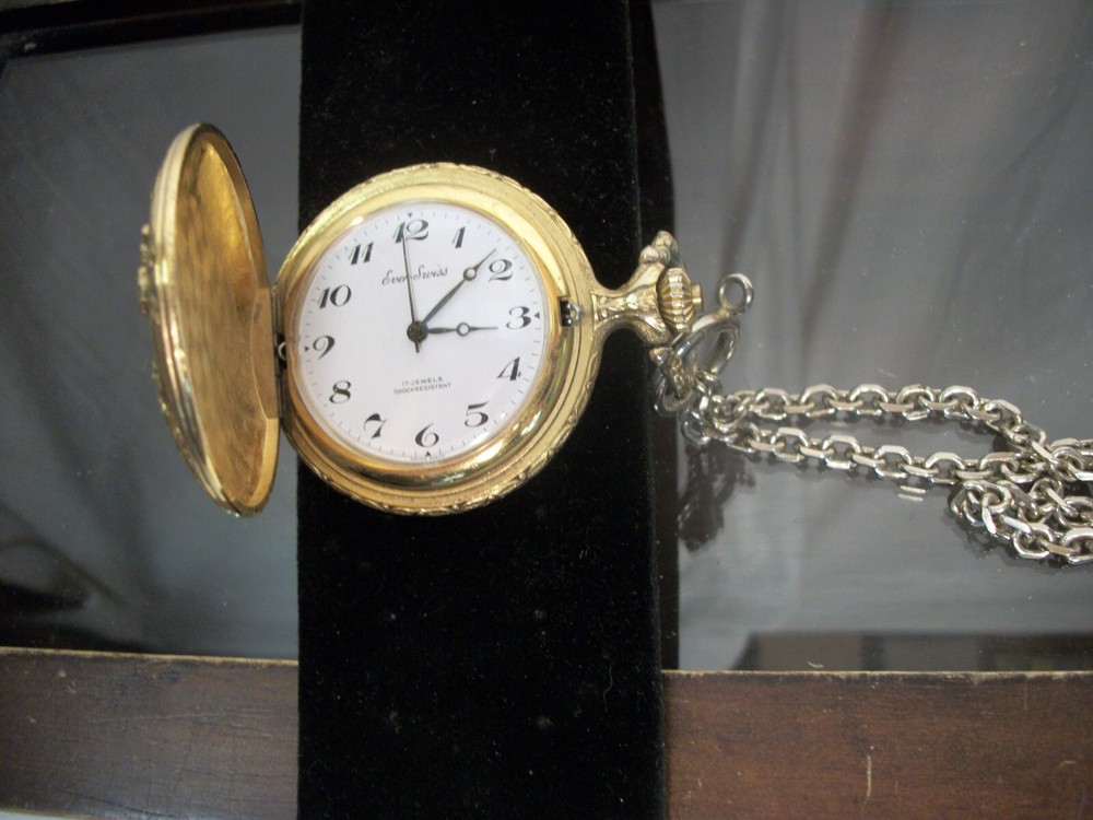 Ever Swiss Pocket Watch Gold Tone Hunter with Dog, 17 Jewels Swiss, Shock Resistant, NOT WORKING