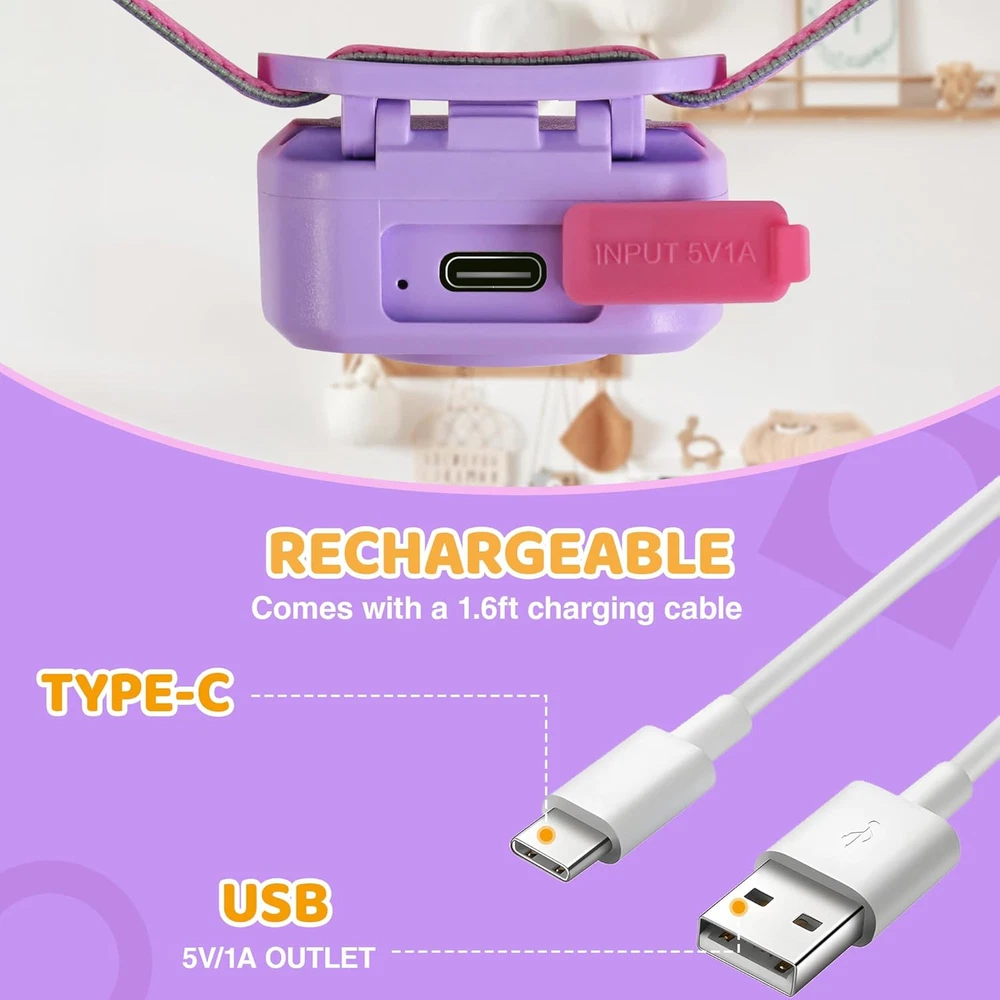 EverBrite LED Headlamp Rechargeable Kids with RGB Mode and Sweety Product Details Special Feature: Adjustable Light Modes, Rechargeable Color: Sweety Power Source: Rechargeable Light Source Type: LED Material: Plastic White Brightness: 50 Lumens Included Components: Charging Cable, Headlamp Product Dimensions: 2.55"D x 2.44"W x 1.88"H Voltage: 5 Volts Battery Cell Composition: Lithium Ion Item Weight: 0.08 Kilograms Number of Batteries: 1 Lithium Ion batteries required. (included) Water Resistance Level: Not Water Resistant Brand: EverBrite Brightness: 50 lumen Battery Description: Lithium-Ion Bulb Base: GU5.3 Mounting Type: Head Mount Recommended Uses For Product: Camping, Reading, Exploring, Walking the dog, Fishing, Parties, Celebrating Halloween or Christmas holidays Manufacturer: HANGZHOU GREATSTAR INDUSTRIAL CO.,LTD Part Number: E021057 Item Weight: 2.89 ounces Item model number: E021057 Batteries: 1 Lithium Ion batteries required. (included) Item Package Quantity: 1 Special Features: Adjustable Light Modes, Rechargeable Batteries Included?: Yes Batteries Required?: Yes Product Dimensions : 2.55 x 2.44 x 1.88 inches; 2.89 ounces Item model number : E021057 Batteries : 1 Lithium Ion batteries required. (included) Manufacturer : HANGZHOU GREATSTAR INDUSTRIAL CO.,LTD Special Feature: Adjustable Light Modes, Rechargeable Color: Sweety Power Source: Rechargeable Light Source Type: LED Material: Plastic 3 Light Modes: Everbrite kids headlamp for boys& girls features 3 lighting modes: white low light, white high light( 50 lumens with a 33 FT range), and RGB cyclic color change. The gentle white light is perfect for kids' eyes, ensuring a comfortable and safe experience. Tip: 3 modes need to be switched by button Exciting RGB Fun: The third mode of Everbrite kids rechargeable headlamp offers an automatic RGB color cycle. To lock in a specific color, just hold the switch for 2 seconds. This fun head lamp is a perfect gift for Halloween, Christmas, New Year, making playtime more colorful and enjoyment Rechargeable Convenience: Say goodbye to disposable batteries with our LED headlight! Comes with a 1.6ft USB charging cable, you can charge it at any time to maintain continuous use and save on future expenses. When it powers out, just about 1 hour of charging time fully replenishes all power Suitable for Kids of Different Ages: The length of the headband can be adjusted freely with the adjusting buckle, which allows for the perfect fit for kids of all ages. The head of the camping headlamp can be angled to a 45° angle, ensuring that children are more flexible when using or playing Fun Meets Practicality: Lightweight and durable, this Everbrite headlamp for kids is ideal for outdoor adventures, camping, reading, walking the dog, fishing, running, or festive activities like Halloween, and Christmas. The lightweight PC material is easy for kids to carry and wear. Not just a tool-it's a fun toy your kids will love!