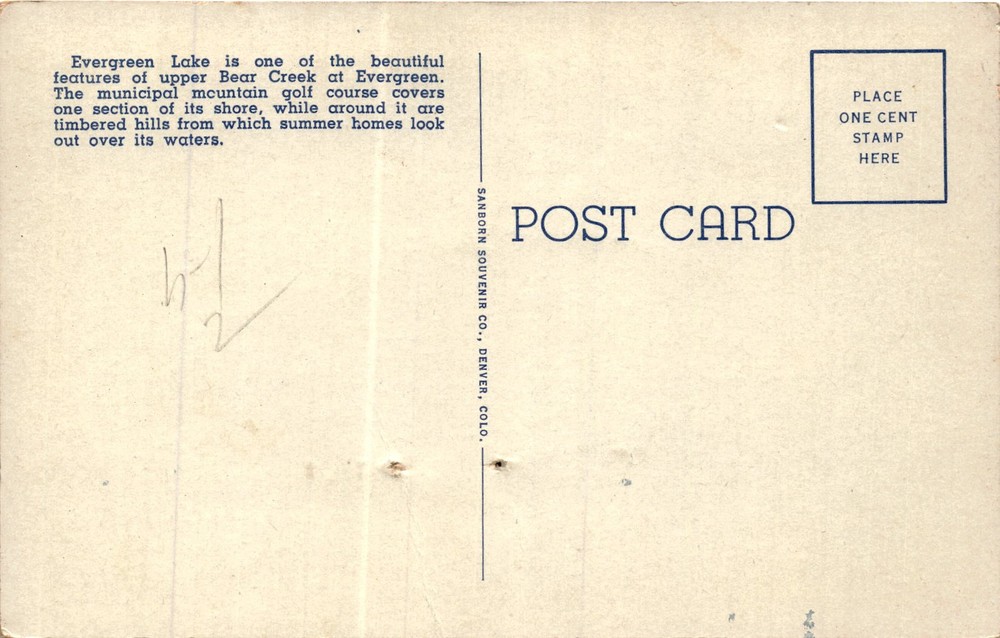 MAKE AN OFFER. THE MORE YOU BUY THE BETTER DEAL I WILL ACCEPT This postcard depicts Evergreen Lake in Evergreen, Bear Creek Cañon, part of the Denver Mountain Parks in Colorado. Evergreen Lake is a stunning feature of upper Bear Creek, surrounded by timbered hills and summer homes. The municipal mountain golf course occupies a section of its shore, adding to the picturesque scenery.