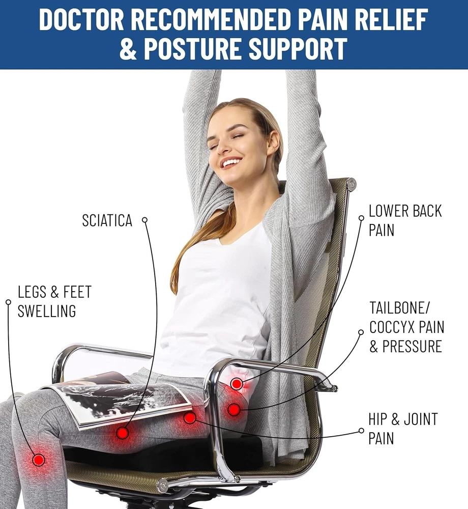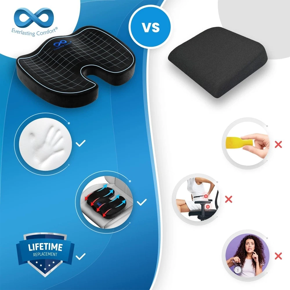 Everlasting Comfort Office Chair Seat Cushion for Back, Coccyx, & Tailbone Pain Doctor Recommended Support & Comfort: Watch our video endorsement to hear why experts recommend this product. Our memory foam seat cushion offers exceptional comfort and support, reducing tailbone pain and promoting healthy posture. Ideal for long sitting sessions. 100 Percent Memory Foam Cushion - Crafted from premium, 100% memory foam, this cushion guarantees lasting durability and reliable support. The memory foam offers a medium firmness of 11.24 pound-force (50 on the Shore 00 scale), making it ideal for those weighing 130 lbs or more. Dimensions: 17"x14"x2.95" Soft & Breathable Cover: Our seat cushion for car features a machine-washable, breathable cover that is easy to clean. The non-slip bottom keeps the butt pillow in place, ensuring stability and comfort Pain Relief & Body Support: The ergonomic "U" shape cutout minimizes tailbone and lower back pain, supporting spinal alignment and enhancing comfort while minimizing gravity's impact on the spine Versatile & Durable: Ideal for office, home, and travel, it fits various seats like office chairs, car seats, and airplane seats and is on the HSA and FSA eligible items only list. Our sciatica pain relief pillow keeps its shape over time CAUTION: Non-slip rubber bottom may stain light colored leather/vinyl. Before use, wash cover in soap and hot water. Once the cover is dry, test for color fastness with a towel and hot water.Treat your back with a pure memory foam seat cushion. Recommended by orthopedists and doctors to alleviate pressure in strategic areas like the tailbone, coccyx, back, spine hips, & sciatic nerves. Also provides added comfort for women during pregnancy. Versatile design is ideal for most commonly sized office chairs, airplane seats, car seats, stadium seats, benches, etc. Please be sure to check our product dimensions (17 x 13.2 x 2.4 inches) to ensure a proper fit.Optimal density for superior comfort and durability for anyone 100-300 pounds. Our removable soft cover is machine washable and slip resistant. If anything happens to your Everlasting Comfort Memory Foam Seat Cushion or you’re unsatisfied for any reason, no need to buy another. We will send you a free replacement or give you a full refund. We take personal pride in delivering ultimate customer satisfaction. We are here to serve you. Shipping We offer FREE shipping on all orders! We ship within Three business days of payment, usually sooner. We use a selection of shipping services such as UPS, FedEx, USPS etc. We only ship to the lower 48 states, no APO/FPO addresses or PO Boxes allowed. Local pickups and combined shipping options are not provided at this time. Return You can return a product for up to 30 days from the date you purchased it. Any product you return must be in the same condition you received it and in the original packaging. Please keep the receipt. Payment We accept payment by any of the following methods: PayPal Please pay as soon as possible after winning an auction, as that will allow us to post your item to you sooner! Feedback Customer satisfaction is very important to us. If you have any problem with your order, please contact us and we will do our best to make you satisfied. Contact Us If you have any queries, please contact us via ebay. We usually respond within 24 hours on weekdays. Please visit our eBay store to check out other items for sale! Thank you for shopping at our store.