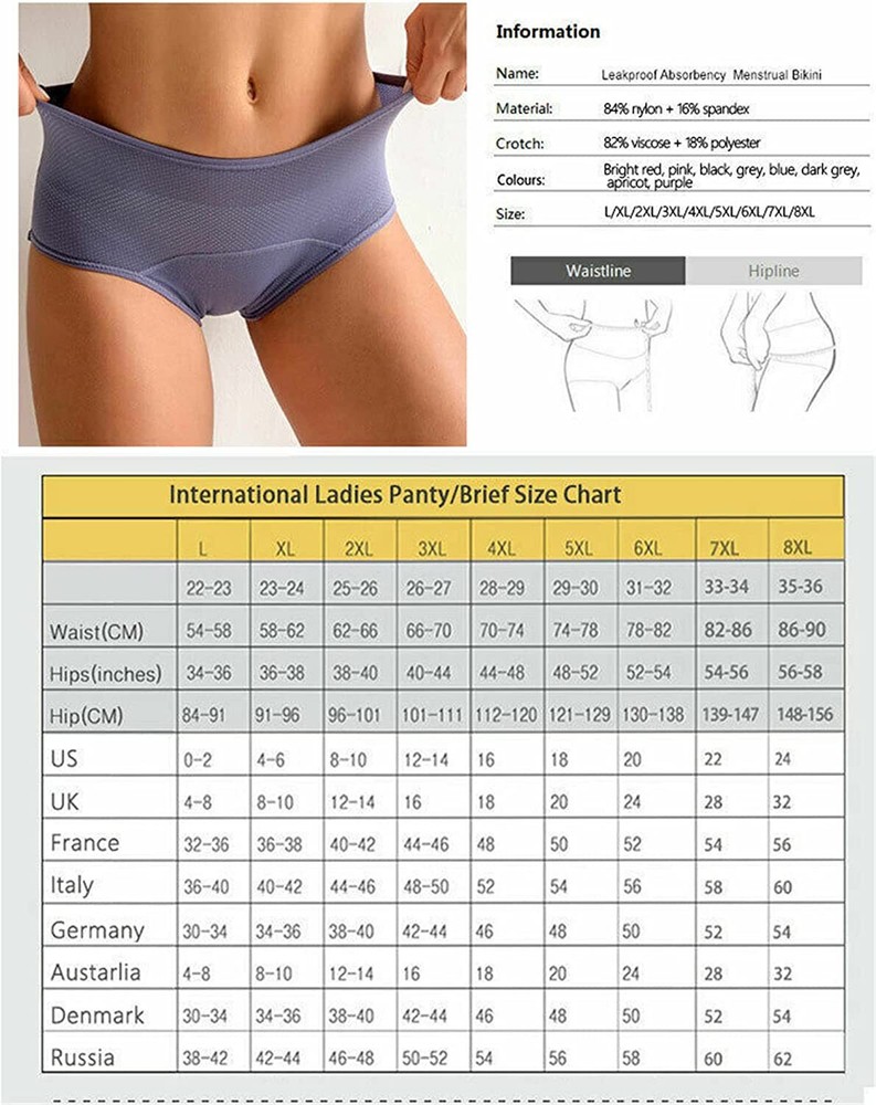 Product Description Features: 100% Brand New, High Quality, Fashion Design. Thin Sticky fiber material made, soft comfortable to wear. waterproof fabric, postpone penetration time. Prevent side leakage. Specification: Size: L~8XL Style: Fashion physiological underwear Fashion element: leakproof broaden widen Note: Please check the measurement chart carefully before you buy the item. Package included : 1 x leak proof protective panties Note: 1.Due to manual measurement, please allow a difference of 1-5g/1-2cm. 2.Due to different displays and different lighting, the picture may not reflect the actual color of the item. Thank you for your understanding.
