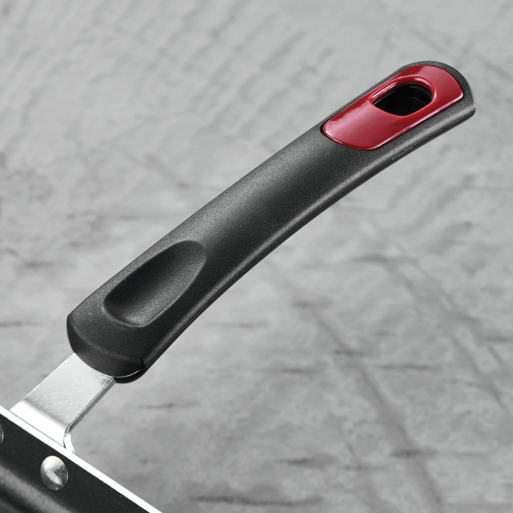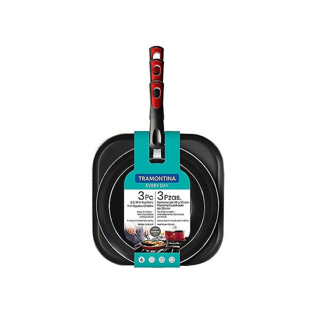 Tramontina every day 3 Pc Aluminum Nonstick Fry Pan and Griddle Set makes quick work of bacon, eggs, and pancakes not to mention the perfect grilled cheese. The 8 in and 10 in fry pans give cooks the option to multitask on their stovetops with more cook space. The fry pans and the griddle are made with aluminum construction for reliable and quick heat distribution. The pieces feature a metallic red finish for added color in your kitchen. The red finish pairs perfectly with the cookware's charcoal gray interior finish. The cookware's nonstick interior protects the cooking surface from sticking to the surfaces for mess-free meal prep. You'll get safe and easy maneuverability thanks to the cookware's ergonomic Bakelite handle. The dishwasher-safe pans and the griddle are compatible with gas, electric, and ceramic glass cooktops and are made in Brazil. Key pieces needed for browning, frying, and sauté meals for small and large groups Quick heat distribution Vibrant metallic red exterior Nonstick interior Ergonomically designed black Dishwasher safe Tramontina Everyday Collection Set includes: 8 in Frypan 10 in Frypan 11 in Square griddle