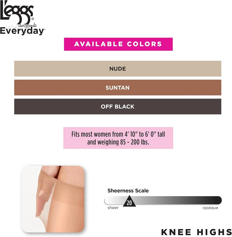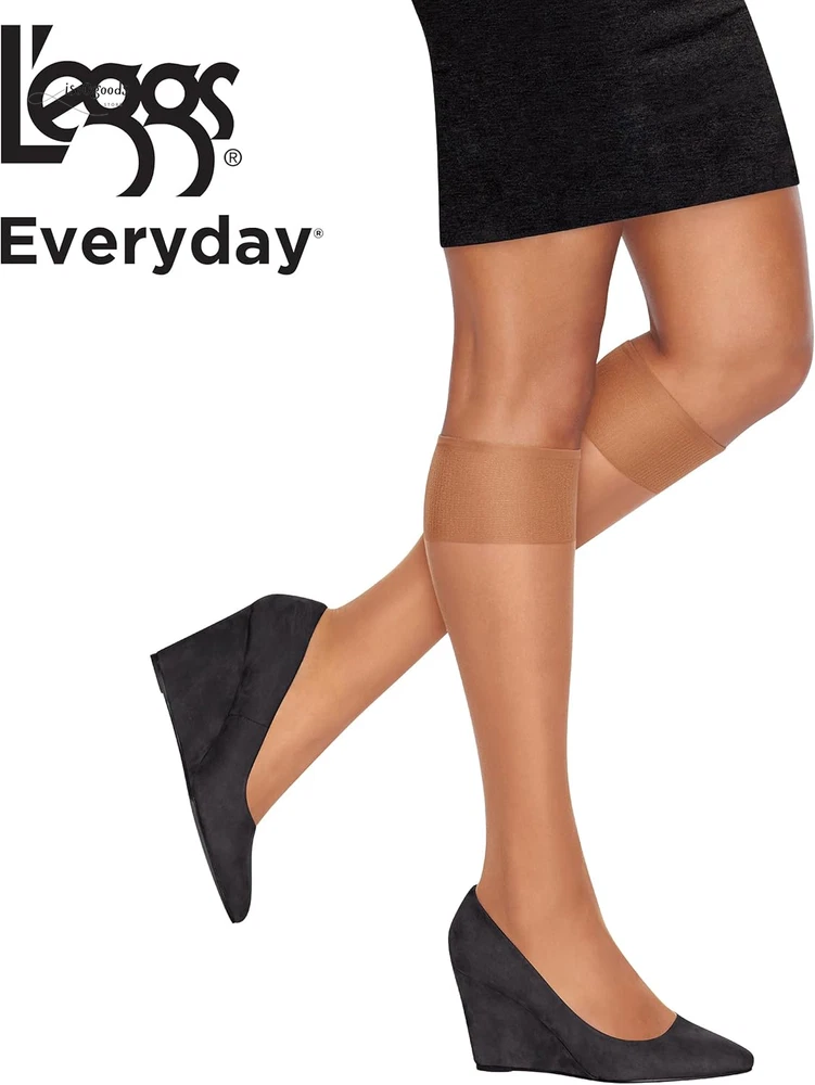 Elevate your everyday essentials with the L'eggs Everyday Reinforced Toe Knee High Stockings. Designed for comfort, durability, and timeless style, these knee-high stockings are the perfect addition to any wardrobe. The classic knee-high length adds a touch of sophistication to any outfit, while the neutral tones effortlessly complement a variety of styles and ensembles. Whether paired with skirts, dresses, or trousers, these stockings effortlessly elevate your look with a polished finish. Enhanced with a reinforced toe, these stockings are designed to offer exceptional durability and longevity, making them perfect for everyday wear. The reinforced toe area is crafted to withstand the rigors of daily wear, providing extra strength where you need it most. Constructed with quality materials and expert craftsmanship, the L'eggs Everyday Reinforced Toe Knee High Stockings offer unbeatable value and style. Treat yourself to comfort, durability, and grace with this essential wardrobe staple. Whether you're heading to the office or stepping out for a special occasion, L'eggs Everyday Stockings elevate your style with timeless elegance and unmatched comfort.