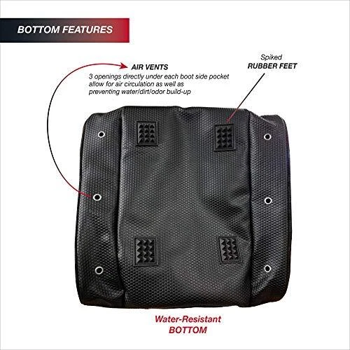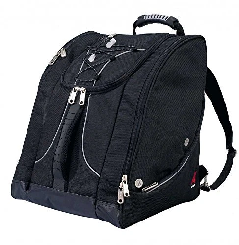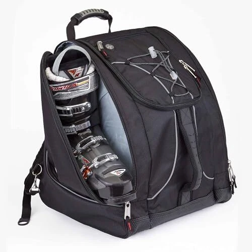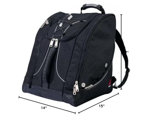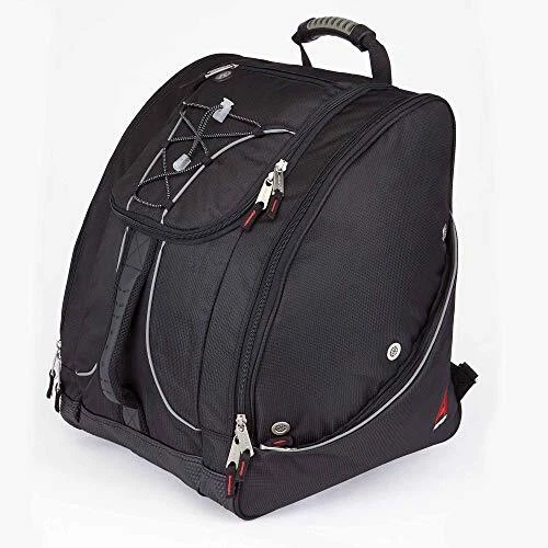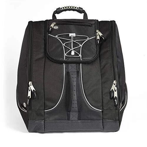 Description Pack a jacket, helmet, boots, and all your must have gear in this bag for your next outdoor adventure. The "Everything" Ski Boot Bag is loaded with features to suit your active lifestyle. The boot bag features zippered, ventilated side pockets for boots, a center section for a jacket, helmet, or clothing, an MP3 pocket on the front with headphone port, and clips in each pocket for gloves, keys, and other small accessories. There are bottom drainage grommets, a waterproof PVC bottom, a bungee cord on the front to hold a jacket or clothing layers, and reflective piping for increased visibility. Other features of this ski boot bag include padded hidden backpack straps, four padded lumbar back pads for comfort, and versatile top and front carry handles. ADVENTURE TRAVEL READY – pack a jacket, helmet, boots, and all your must have gear in this bag for your next outdoor adventure. The "Everything" Boot Bag is loaded with features to suit your active lifestyle AMAZING STORAGE – the boot bag features zippered, ventilated side pockets for boots, a center section for a jacket, helmet, or clothing, an MP3 pocket on the front with headphone port, and clips in each pocket for gloves, keys, and small accessories COMFORT FEATURES – this bag include padded hidden backpack straps, four padded lumbar back pads for comfort, and versatile top and front carry handles SPECIAL FEATURES – bottom drainage grommets, a waterproof PVC bottom, a bungee cord on the front to hold a jacket or clothing layers, and reflective piping for increased visibility DIMENSIONS: 17" x 15" x 14" / Capacity = 3570 cu. in. (58.5 liters) / Weight = 3.8 lbs. / Fits boots up to Size 13 men’s Constructed of high density polyester with waterproof backing Separate side entry zippered boot sections. Linear inches: 46 inches Reinforced, padded hidden backpack straps Bottom waterproof tarp to keep bag and contents from getting wet Contour shape fits boots and provides effortless transportation