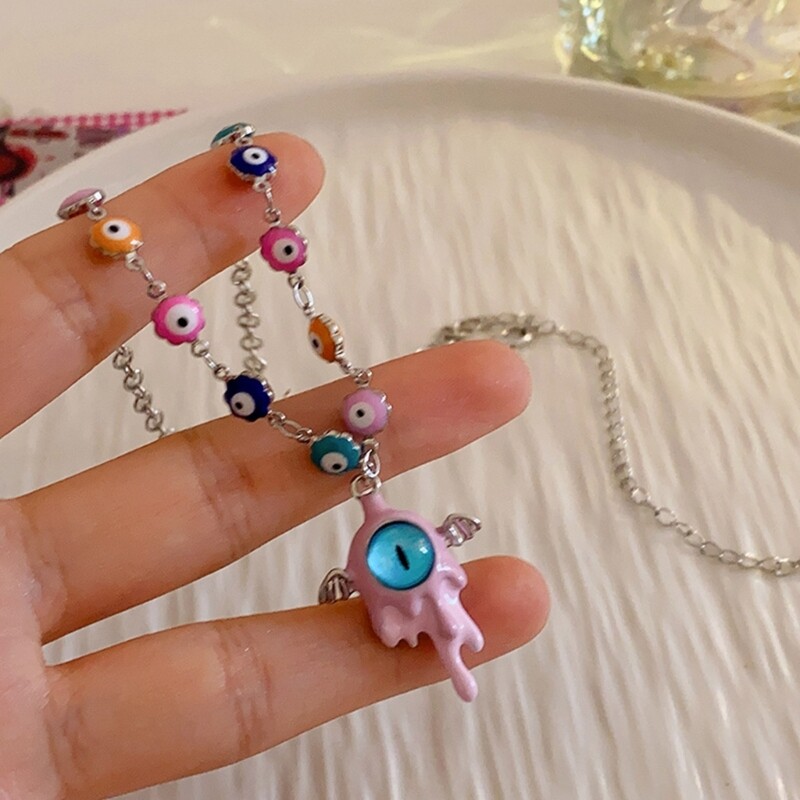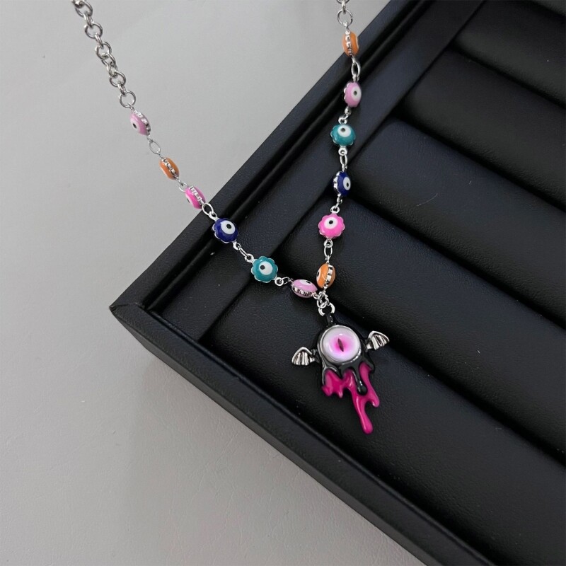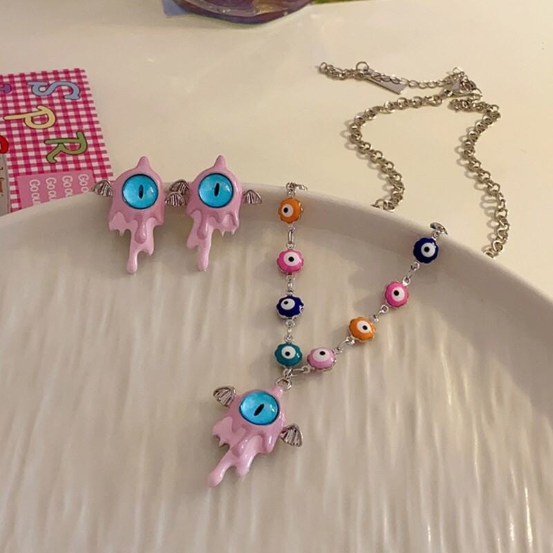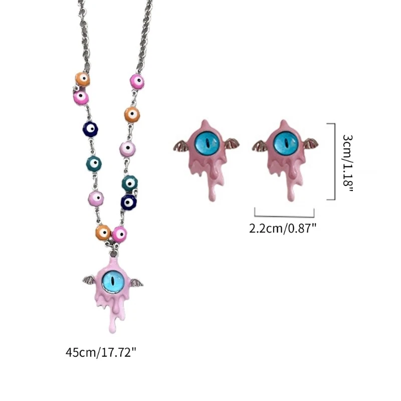 Features: Stand out from the crowd with this colorful cartoon evil eye necklace. Its unique and vibrant color make a must-have accessory for those who like to make statements. Made from quality alloy, this necklace is not only stylish but also durable, ensuring long-lasting wear. The eye-catching colored eyes add touches of playfulness to any outfit. Perfect for fashion-forward women who want to express their individuality, this necklace is suitable for all age. Whether you're a trendsetter or simply look to add touches of color to your wardrobe, this piece is for you. Wear this necklace to parties, festivals, or casual outings to instantly elevate your look. It is also a great conversation starter and makes for a fun and unique gift option for friend and loved ones. your inner wild side with this charm and whimsical necklace. Let the cartoon evil eye bring touches of fun and mischiefing to your everyday Specifications: Material: Alloy Color: Red/Black Necklace Length: Approx. 17.72inch(45cm) Earring Size: Approx. 0.87x1.18inch(2.2x3cm) Necklace Type 2: Ear Studs Package Includes: 1x Pendant Necklace Or Pair Ear Studs note: Please allow 1-2cm errors due to manual measurement. Due to the difference between different monitors, the picture may not reflect the actual color of the item.