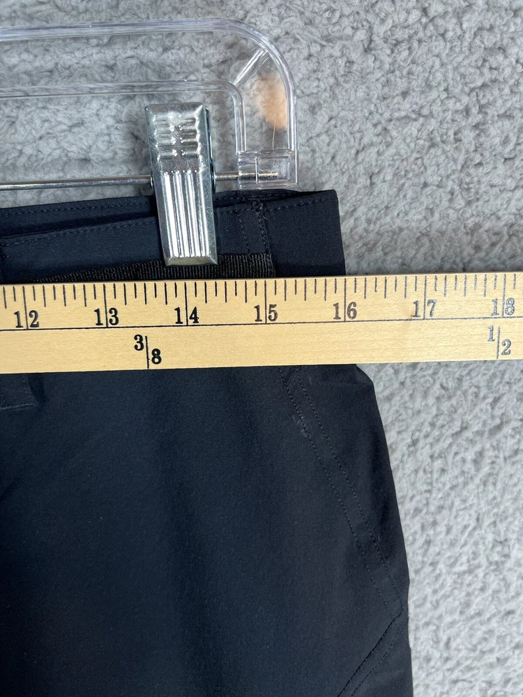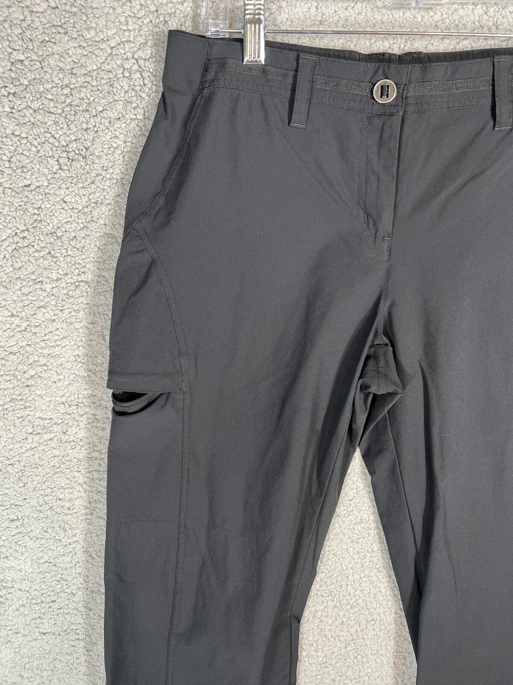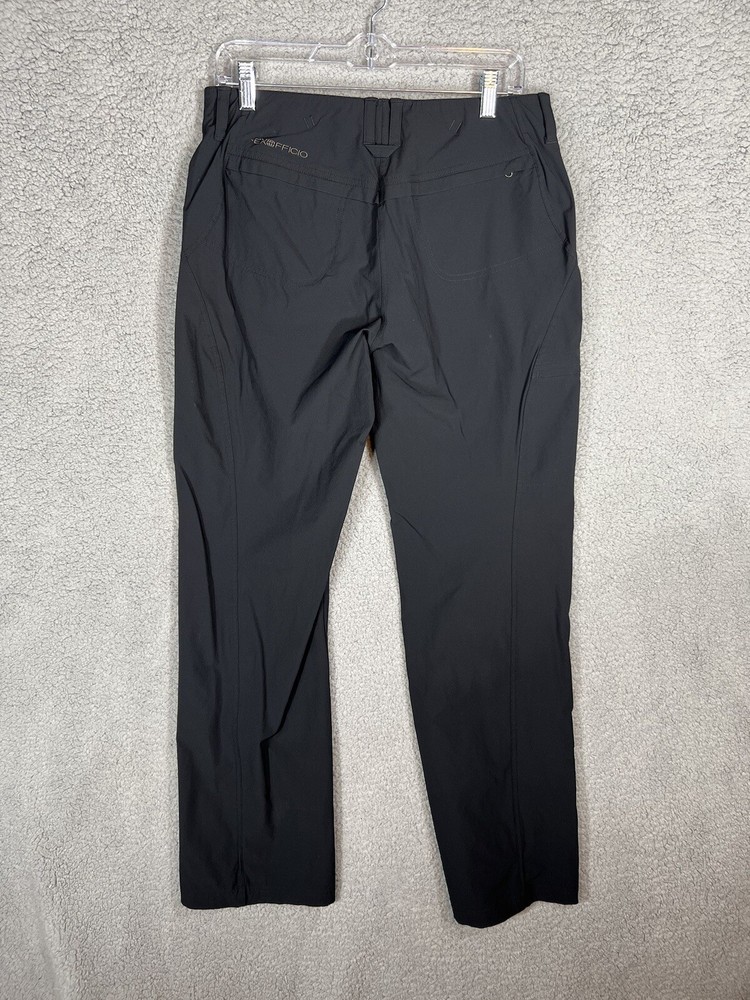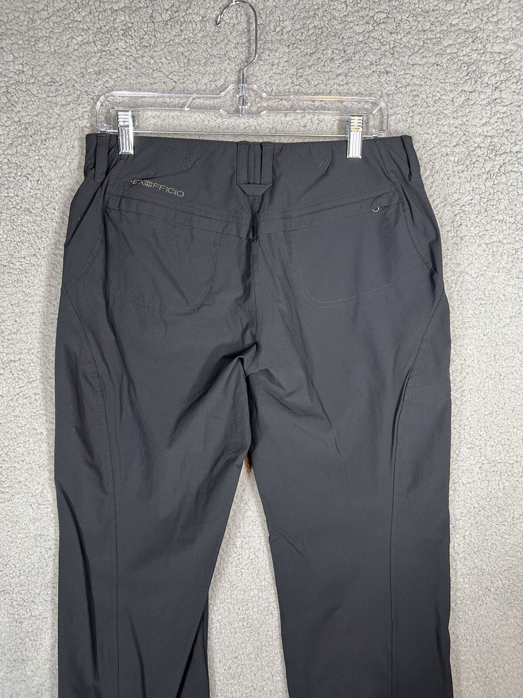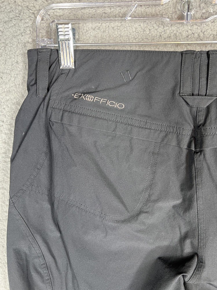 ExOfficio Black Nylon Golf Hiking Cargo Pants. Women's Size 8. Zipper and button closure with elastic waist and beltloops. These pants have 3 pockets with zipper closures (2 back and 1 cargo). Nylon/Spandex blend material. Excellent pre-owned condition. A pproximate measurements: Waist: 16 inches flat Rise: 10.5 inches Inseam: 31.5 inches Please see measurements as all brands can vary in size.