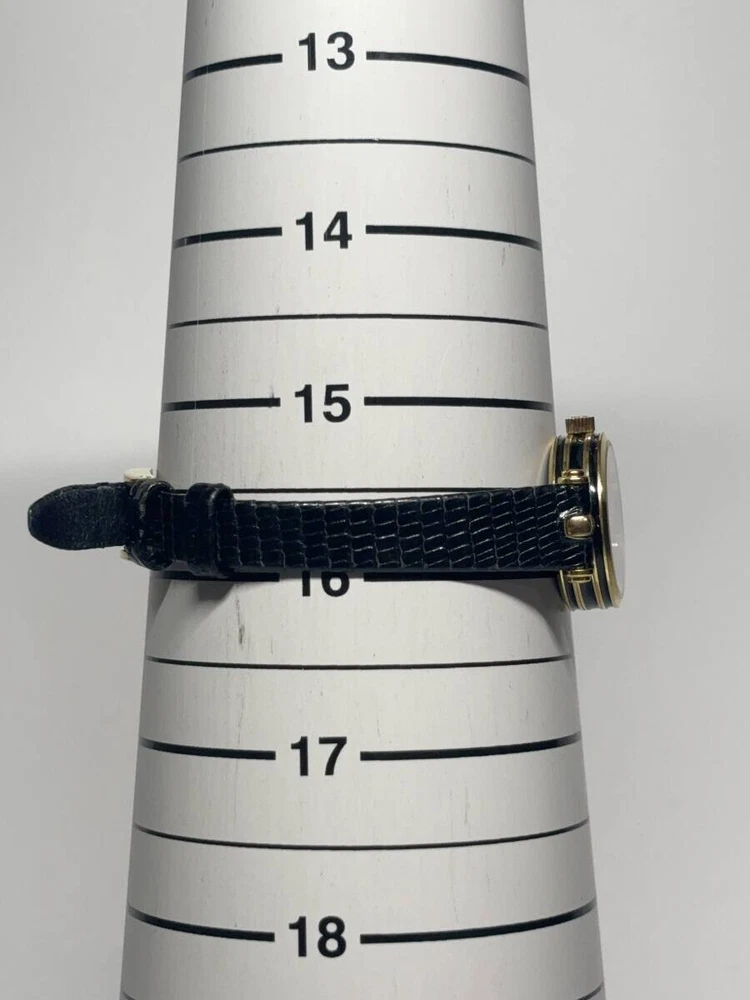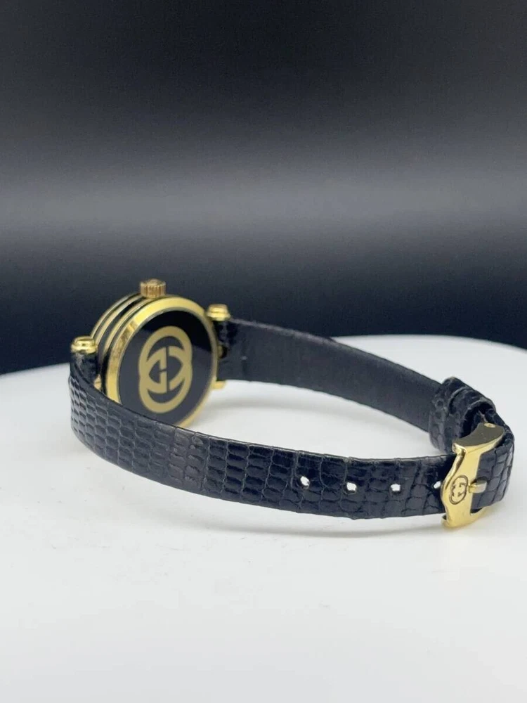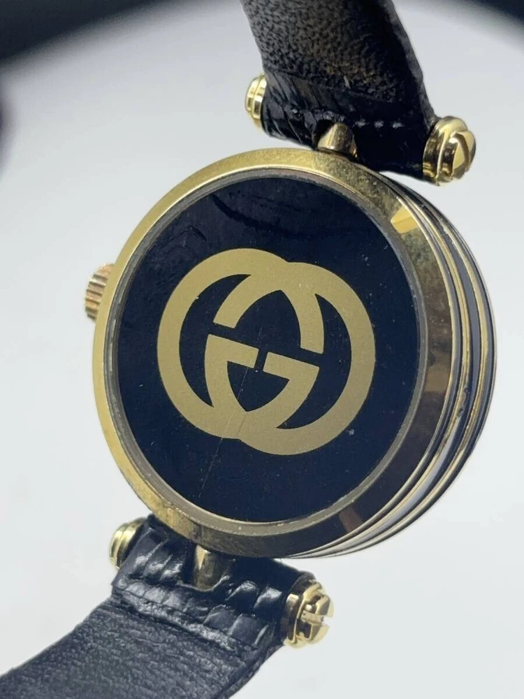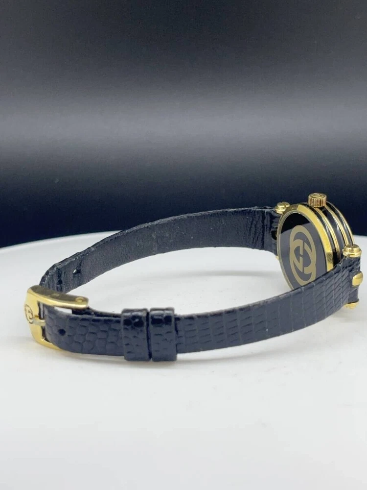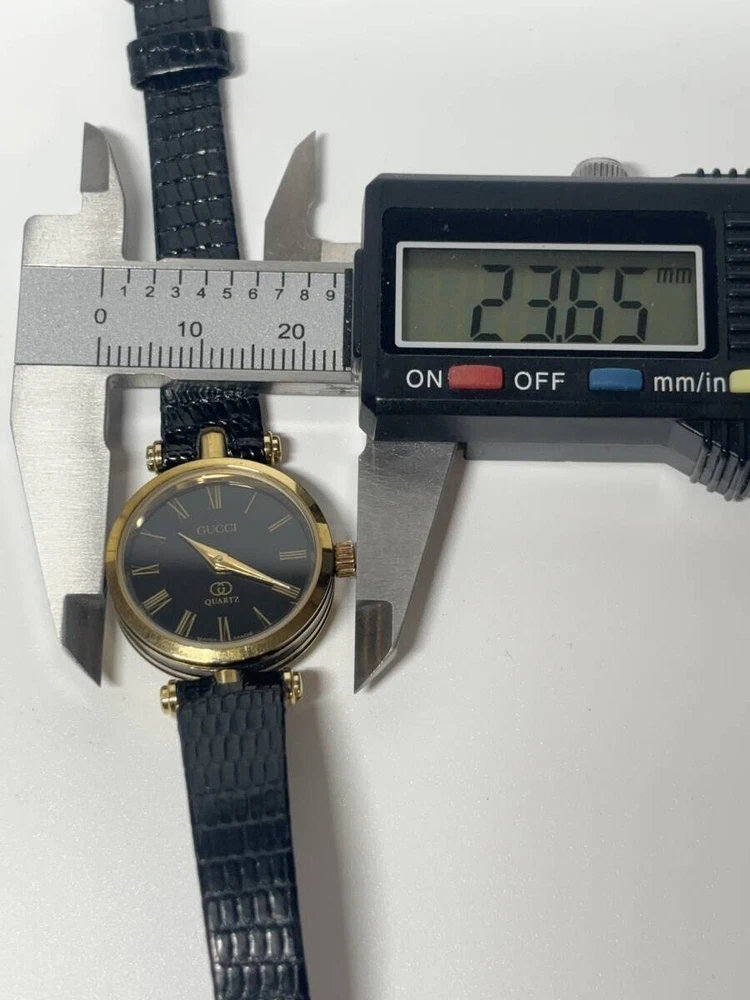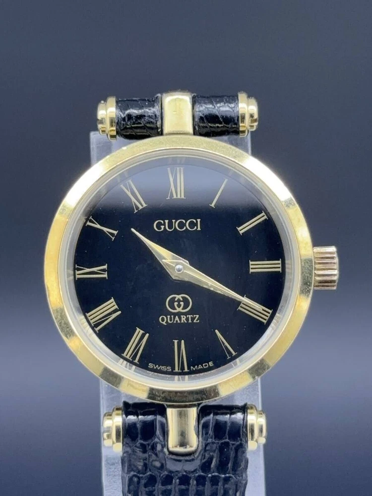Band Color: Black Model: Gucci 2000L Type: Wristwatch Brand: Gucci Case Size: About 21mm Department: Women Customized: No Display: Analog Seller Notes: “Please see photos and description.” Country/Region of Manufacture: Japan Movement: Quartz Case Color: Gold Water Resistance: N/A Indices: Roman Numerals With Original Box/Packaging: No Year Manufactured: N/A Band Material: Leather Max Wrist Size: 16.7cm Features: 12-Hour Dial Dial Color: Black Style: Dress/Formal With Papers: No Bezel Color: Gold Case Material: Stainless Steel Reference Number: 2000L