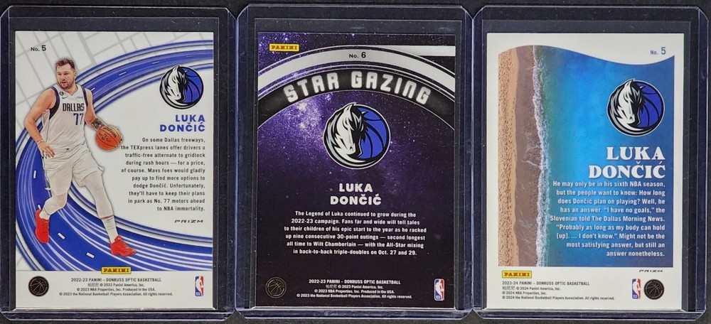 Sport: Basketball Vintage: No League: National Basketball Association (NBA) Manufacturer: Panini Features: Hologram, Insert, Parallel, Short Print Year Manufactured: 2023 Seller Notes: “Near mint or better.” Team: Dallas Mavericks Autographed: No Number of Cards: 3 Set: 2022-23 Panini Donruss Optic, 2023-24 Panini Donruss Optic Season: 2022-24 Card Size: Standard Material: Card Stock Language: English Type: Sports Trading Card Player/Athlete: Luka Dončić Original/Licensed Reprint: Original Country/Region of Manufacture: United States
