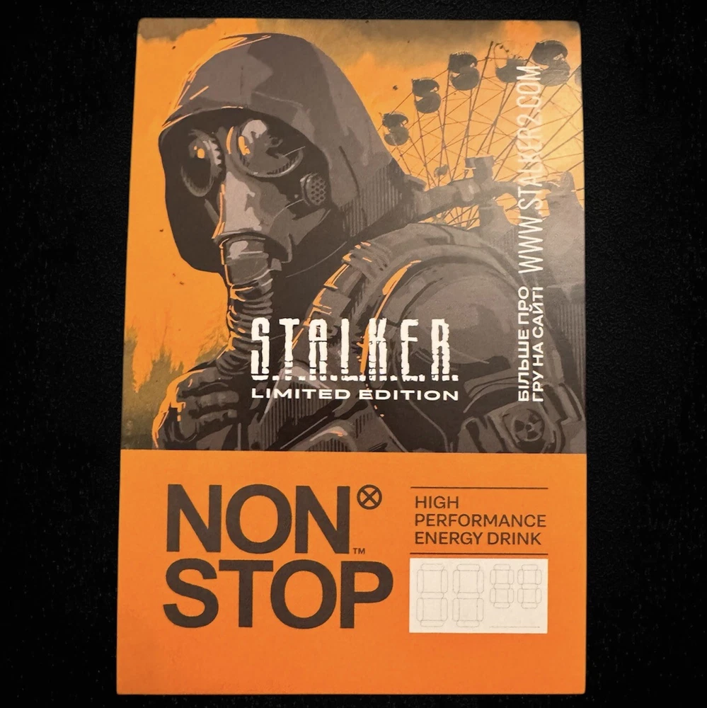 Limited set includes 1. One Full Drink Cans High Performance Energy Drink NON STOP STALKER LIMITED EDITION UKRAINE 2024 FULL DRINK CANS 250 ml, 25 cl. 8.45 oz 2. Large limited edition poster-sticker 3. Large presentation advertising price tag 4. Advertising cup holder for 2 cans Limited collection batch of energy drink NON STOP S.T.A.L.K.E.R. Moonlight S.T.A.L.K.E.R. Moonlight will be on sale for a limited time. And in the game of the Ukrainian studio GSC Game World, the already well-known classic Non stop Original will appear, which will increase the endurance of the characters. The design of the can repeats the aesthetics of S.T.A.L.K.E.R. “Moonlight is one of the most powerful artifacts of S.T.A.L.K.E.R. It gives the ability to move longer and faster. Trying the same drink in the game and during the game is a double fan. All 4 items in the lot are original Dear buyer! Buying goods from Ukrainian sellers, you help Ukrainians resist Russian aggression. Thank you very much for your help!