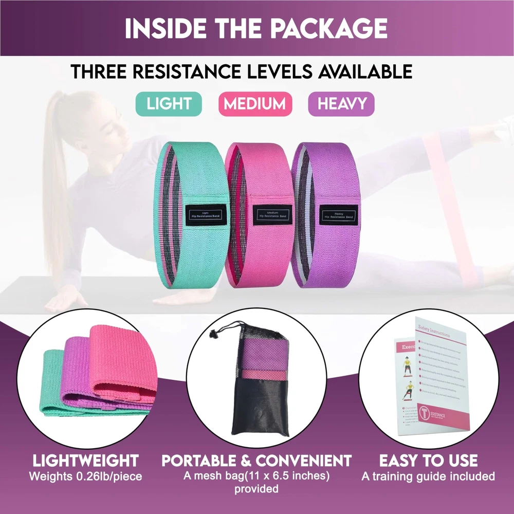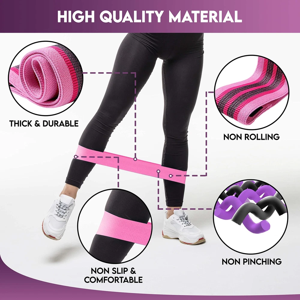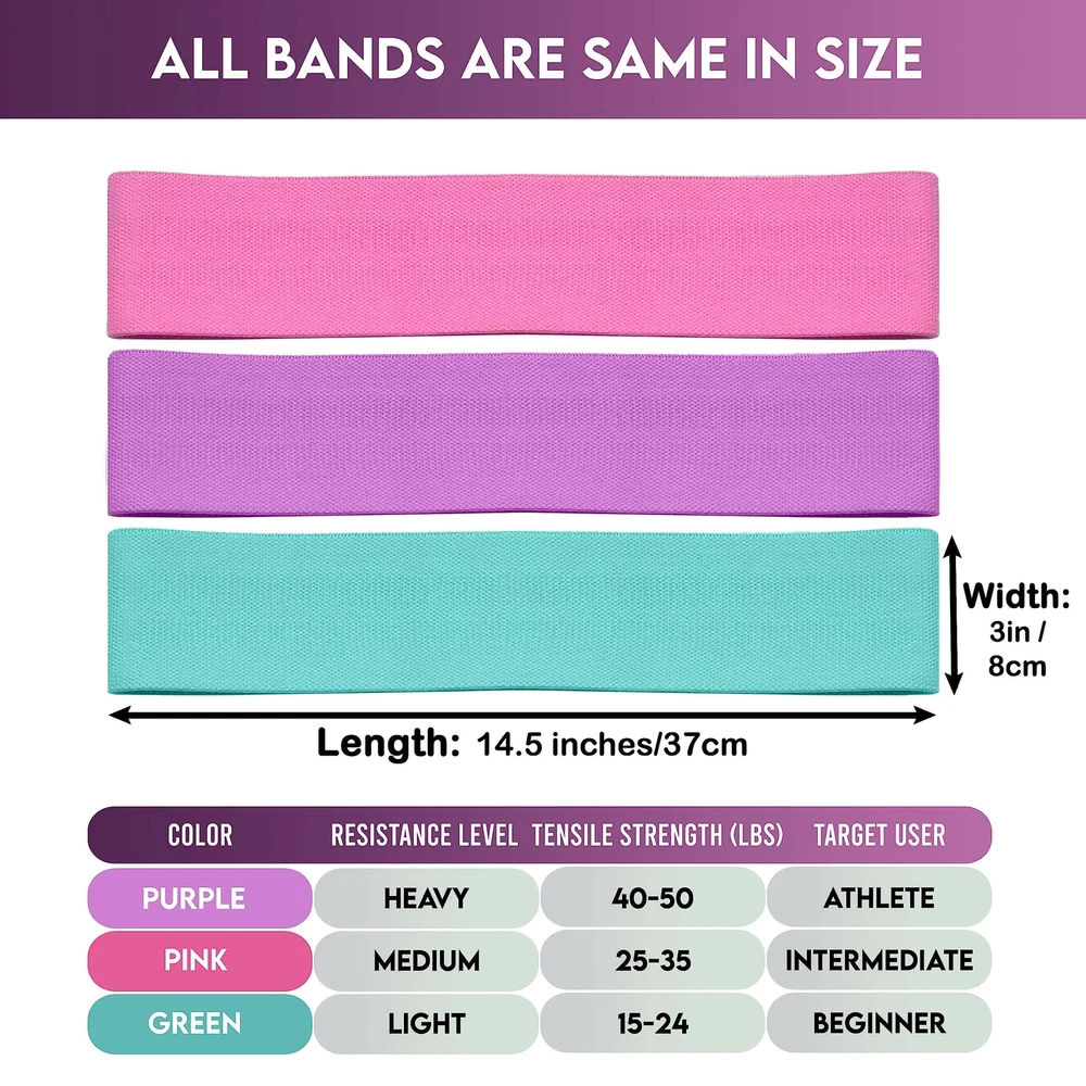 booty bands for working out are crafted from high-quality, soft, and durable fabric, ensuring utmost comfort during exercise. The non-slip design guarantees that the bands stay firmly in place, preventing any unwanted rolling up or sliding down during workouts. Our elastic bands are suitable for both men and women and are tailored to suit various fitness activities such as strength training, yoga, pilates, rehab, and more. They are the ultimate fitness tool for toning and shaping your lower body, including your legs and glutes. Additionally, you can use them to perform a wide range of upper body exercises such as bicep curls, shoulder presses, and tricep extensions. ✓ 3 LEVELS OF RESISTANCE - The workout bands resistance for women and men come in three different levels of resistance, perfect for those with varying levels of fitness, allowing you to increase or decrease the intensity of your exercises based on your specific needs and fitness goals. ✓ COMFORTABLE AND NON-SLIP - Designed for ultimate comfort and stability, our loop bands for exercise ensure a pinch-free, secure fit throughout your home workouts. ✓ PREMIUM QUALITY - Manufactured with high-quality materials, our durable fitness bands are built to endure long-term use without breaking or tearing. They retain their elasticity even after frequent use with workout equipment and intense activity. ✓ PORTABLE AND VERSATILE - Lightweight and compact, our glute bands are ideal for on-the-go fitness enthusiasts. Use them anywhere – at home, the gym, park, or while traveling. ✓ TRAINING GUIDE INCLUDED - To help you start, a training guide comes included in each stretch bands set, complete with exercises and tips to maximize your yoga, pilates, strength training experience. ✓ SATISFACTION GUARANTEE - We provide excellent customer service and a satisfaction guarantee. Contact us with any questions or concerns. Enjoy your purchase and elevate your fitness routine!