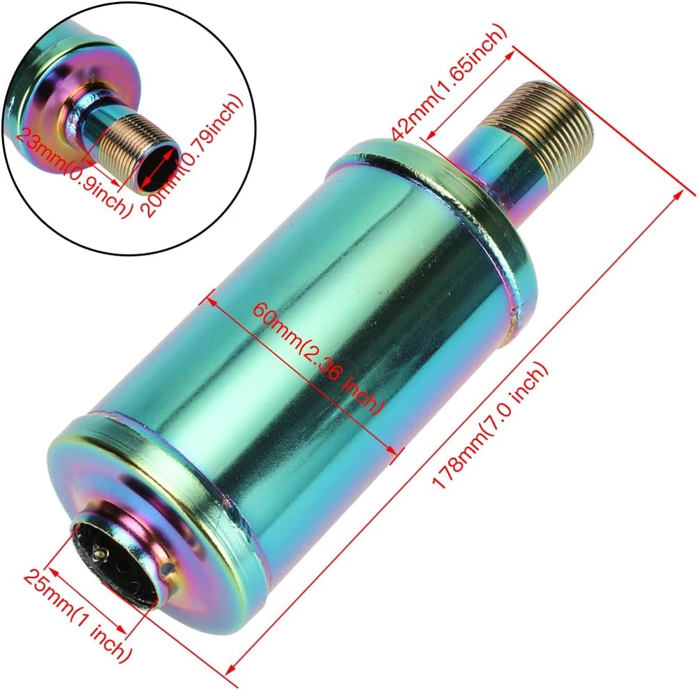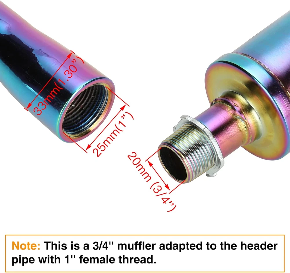 Exhaust Muffler Silencer for Predator 212cc 196cc 420cc CT200u CT200u-ex BT200x 【Fitment】Predator 212 slip on muffler fits for 79cc 98cc 100cc 196cc 212cc 224cc 301cc 420cc Predator 5.5hp 6.5hp engine ,7hp DuroMa* engine ,Hond* GX160 GX200 GX390,Harbor Freight,2hp-4hp Briggs and Stratton engine,Non-Hem/Hemi engine,Powerhorse 208cc ,212cc Tillotson,196cc Hisun engine and some other OHV Clone Small engines. 【Fitment】Coleman CT200u CT200u-ex BT200x CT200U-EXR RB200 Trail 200, Massimo Baja MB200 MB165 ,Mega Moto 212cc Pro,Baja MB165 MB200 (Baja Heat,Mini Baja,Baja Warrior) Monste* Moto Classic 212cc Mini Bike, KT196,Hammerhead 80T,TrailMaster 200cc 163 Mini XRX/R+/XRS Realtre* RTK200 Go Karts, Lawn Mower ,Generators,and some Water Pumps、Pressure Washers、Motors which are equipped with the engine above. 【Features】This is a 3/4'' screw-in muffler adpted to the header pipe with 1'' female thread.Easy to install.Nice welds and excellent chrome polish. It brings out the lowend sounds and it does not sound raspy at all. 【Performance】High-temperature baking process makes this performance muffler a great improvement in rust and high temperature resistance.The thickened inner wall of the silencer can effectively reduce noise without killing power.And it also keeps some back pressure on the engine. 【Note】Please make sure the exhaust pipe thread size is correct to this muffler before purchasing.Due to the irregular distribution of the colors painted on its surface, different mufflers may have a slight difference in color.Pay attention to the direction of the snap ring when installing.You can contact us by email if you have any questions. 【Package include】1 x Exhaust Muffler, 1 x Snap Ring 4.45 inches x 8.94 inches x 2.76 inches. Weight: 12.6 oz Outlet Connection Size 25 Millimeters Color Colorful Material Metal Material Type Metal Manufacturer Part Number XYQ003-Colored Vehicle Service Type Go Kart Compatible with Vehicle Type Go Kart Inlet Connection Size 1 Inches